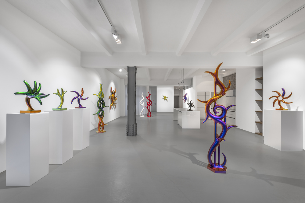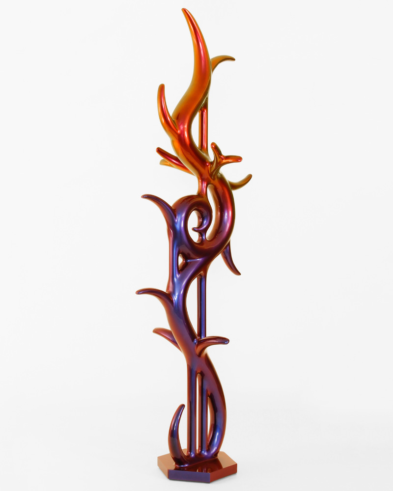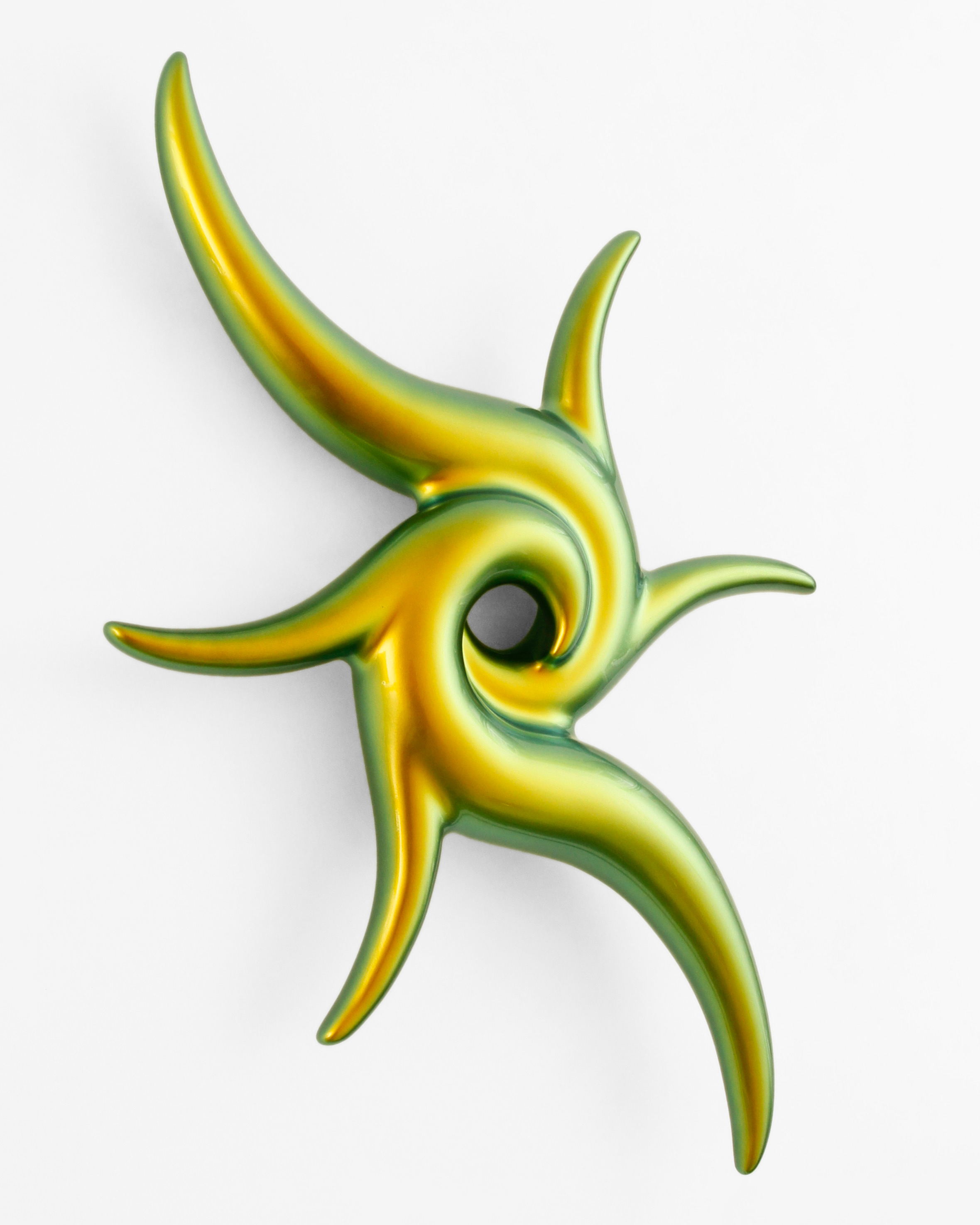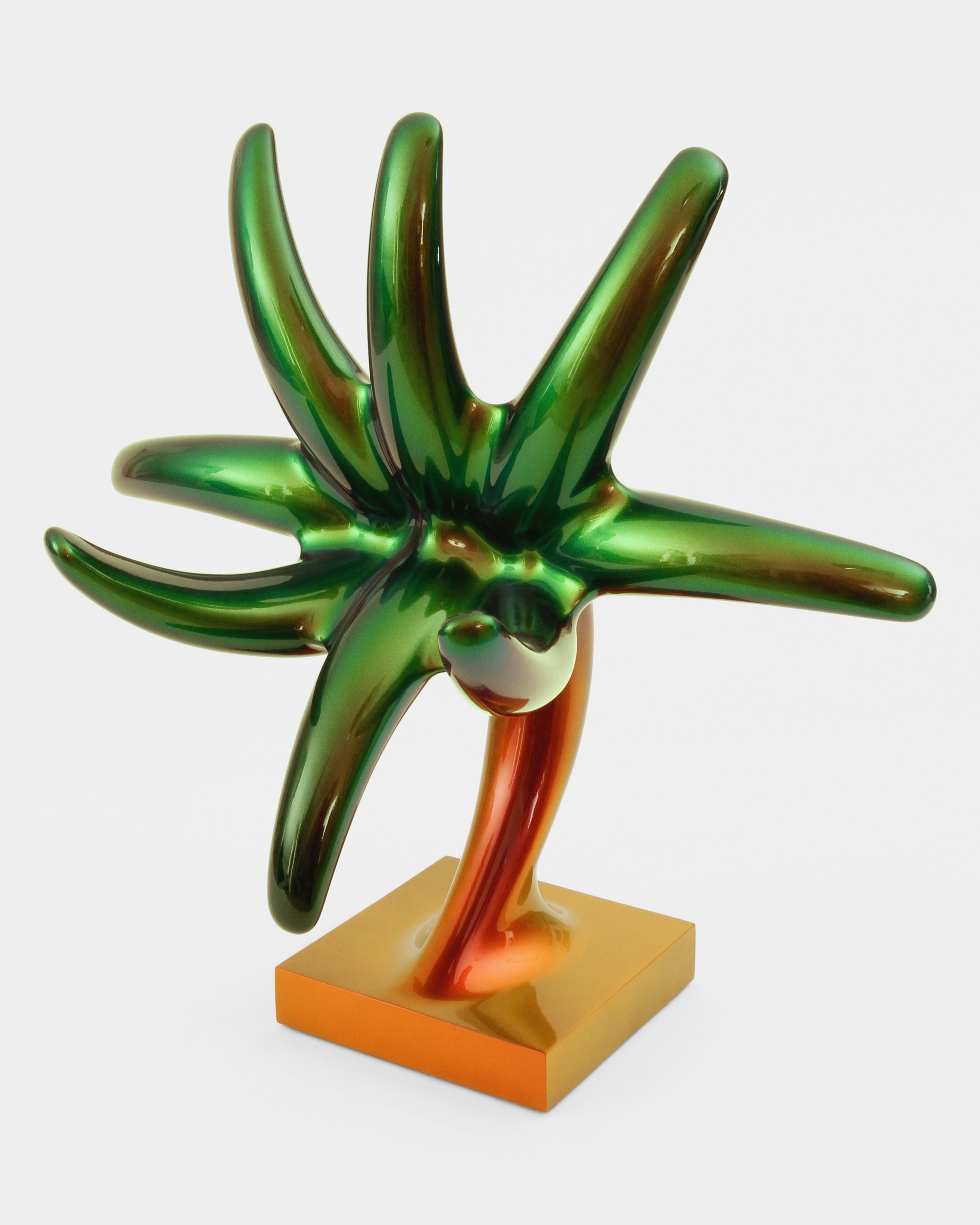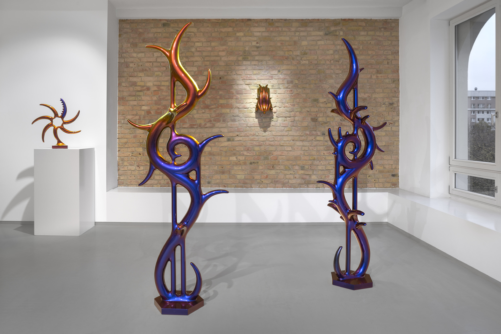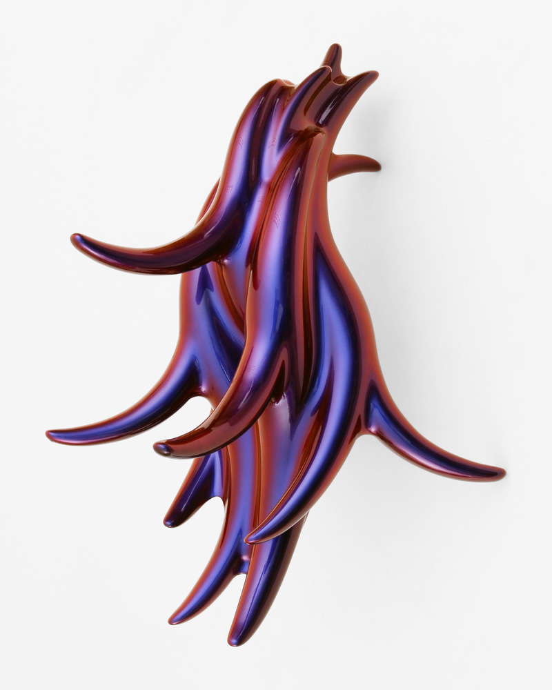 In the beginning was the blob. Curvy, sensual, full of colour. Shapeless and yet formative for the design of the turn of the millennium. Apple's iMac G3 or Nike's Triax watch are prominent examples of so-called "blobjects": tactile objects aesthetically inspired by organic shapes, manufactured using state-of-the-art technology, designed to trigger emotions. As a promise of beauty, pleasure and meaning that has become an object, blob design acts like a projection surface for desires and self-awareness. “Blobjects” stand for an attraction of form that translates directly into physical attraction. Fabian Bergmark Näsman's sculptures twine in pose like sci-fi plants. The invitation to touch seems implied. One could conquer the works like fitness equipment, excite them like playground architecture. They have the visual appeal of chrome nails and tuner cars - or that of a rose chafer. In the end, the futuristic color palette is just borrowed from nature. Bergmark Näsman witnessed the emotionalization of everyday objects as a driver of consumption at the end of the 90s. Aesthetically, the tech optimism before the dot-com crash flashes through in his work. He prefers manual work to industrial production. Behind the flawless surface of his art lies a sincere interest in the process of organic form finding. 2019 Bergmark Näsman made his first mold fragment. All elements of his sculptures are derived from this to this day. He multiplied the prototype with a silicone mold, trimmed and assembled the castings, developed them further - and reassembled them. And it hasn't stopped since then.