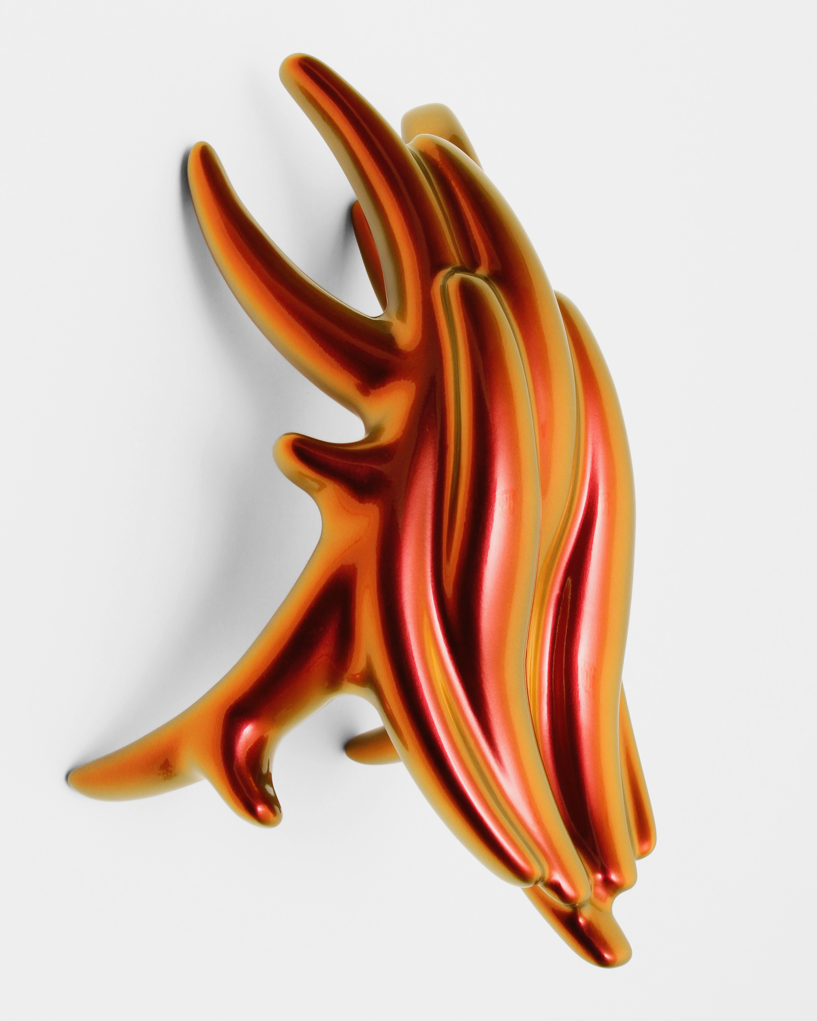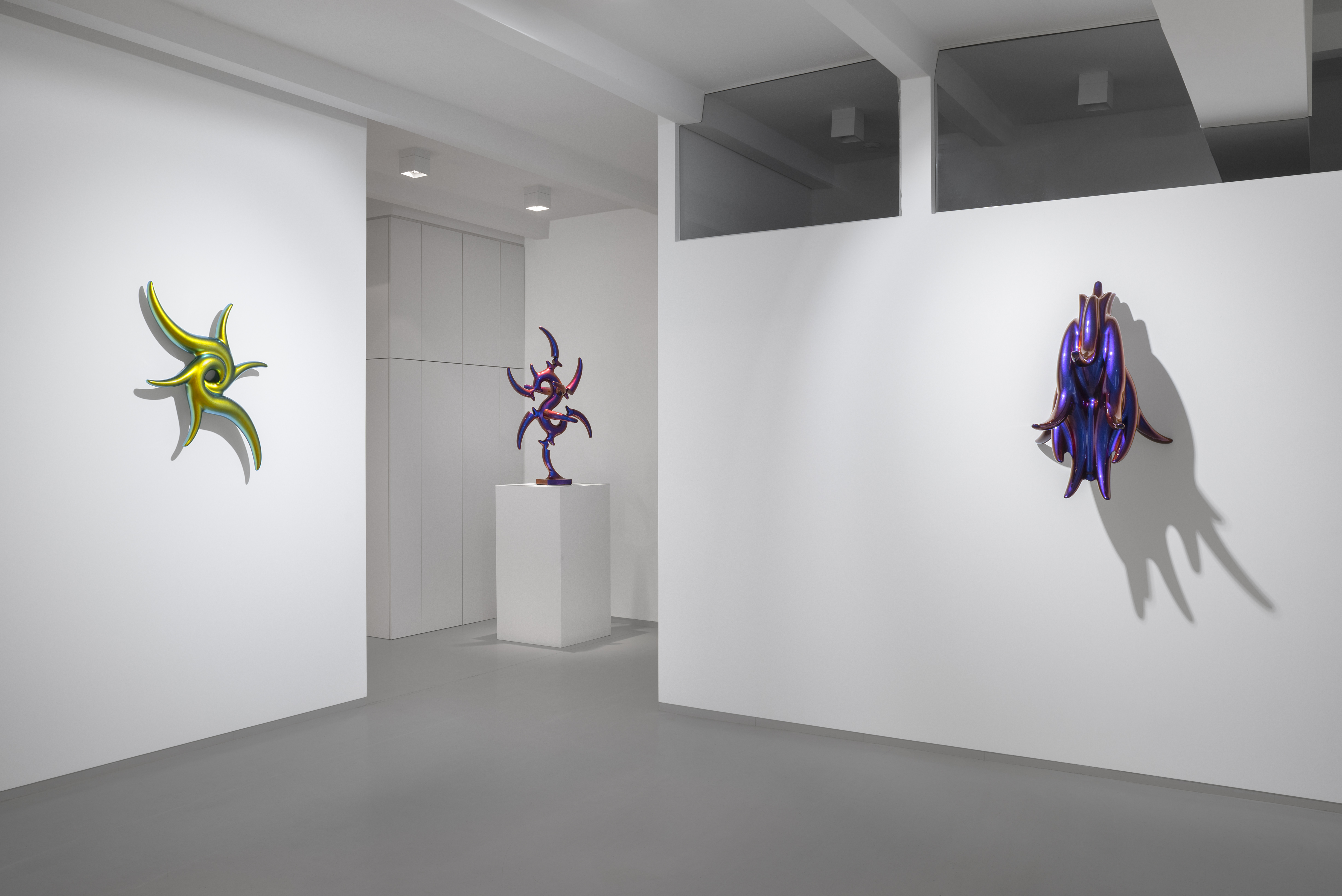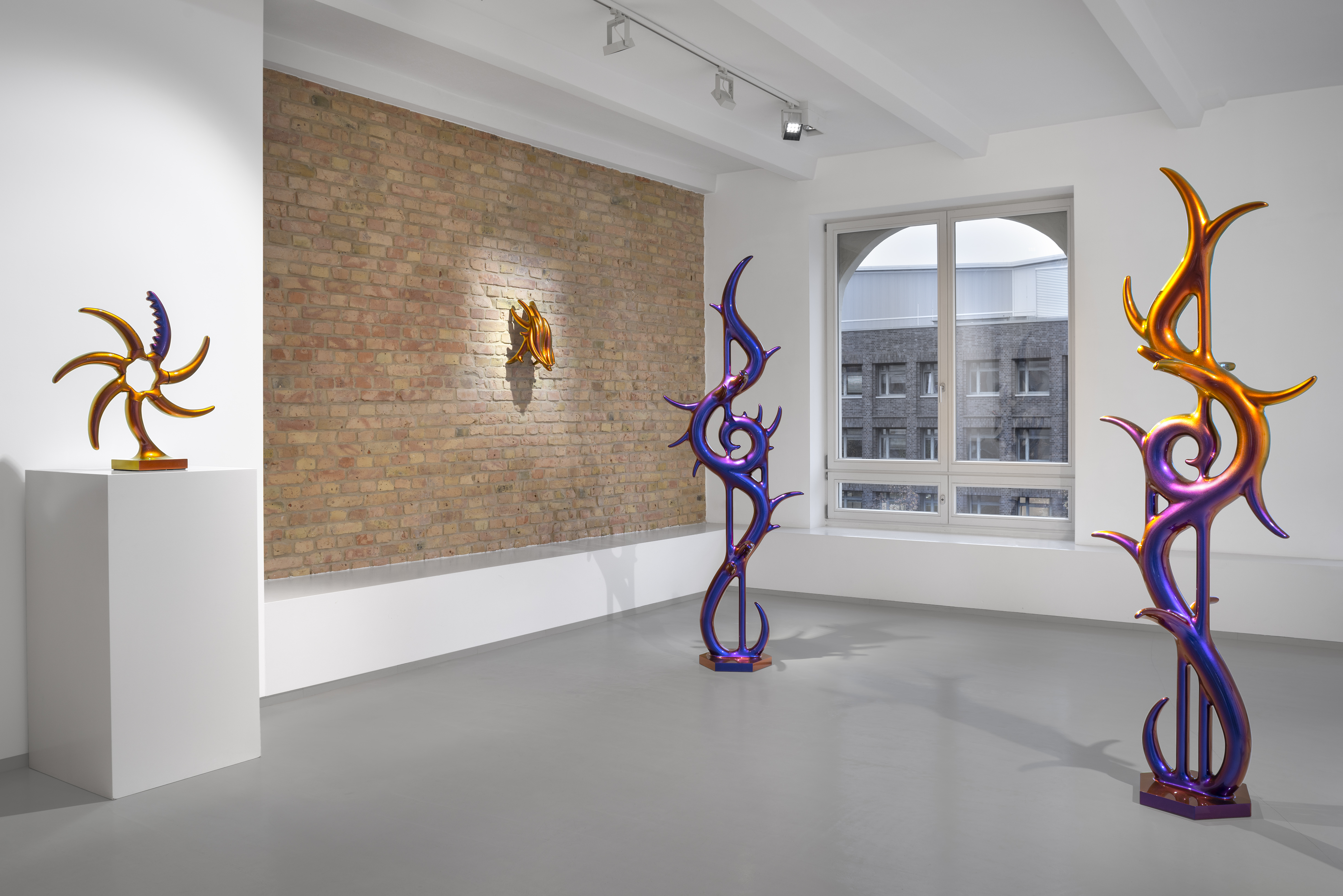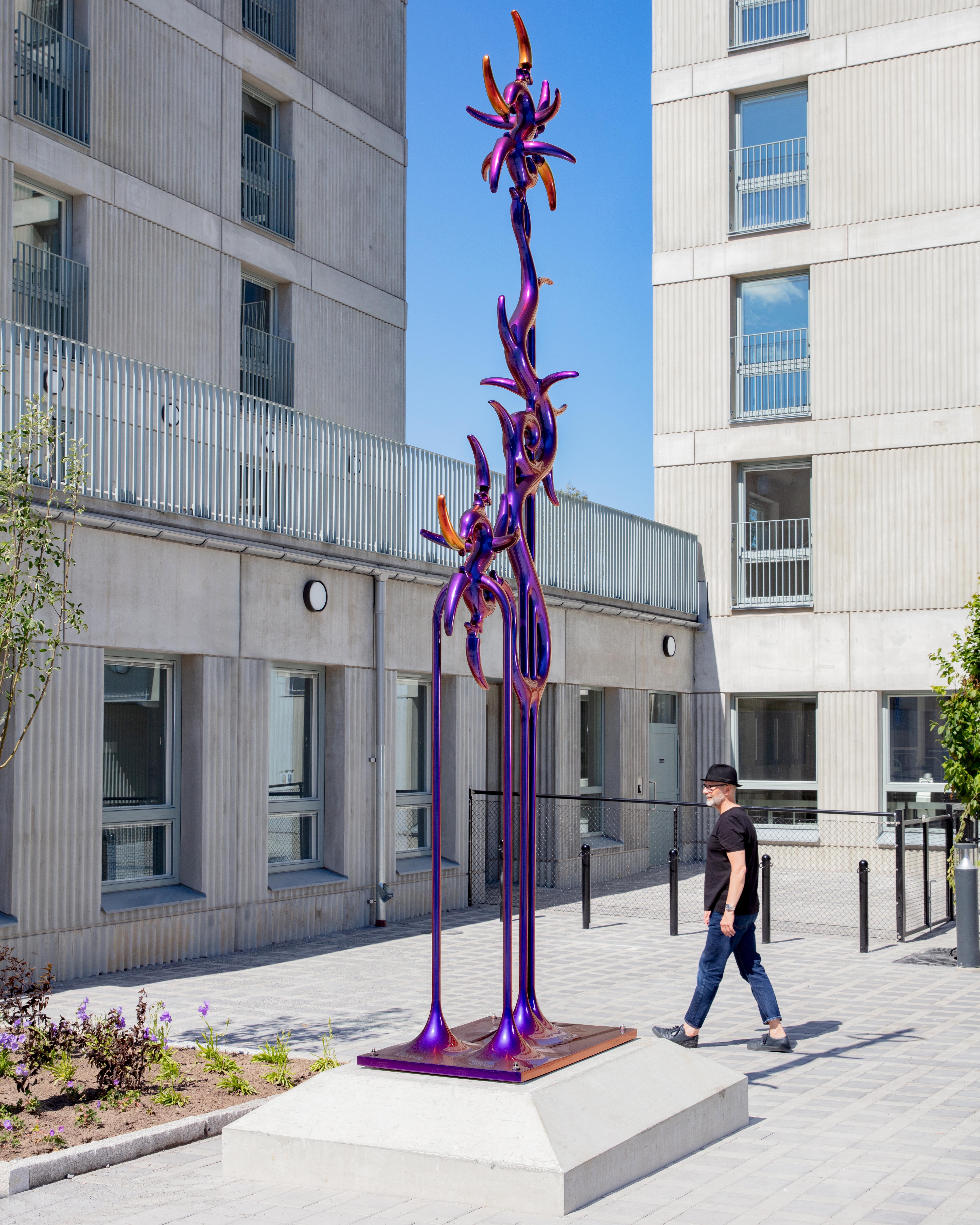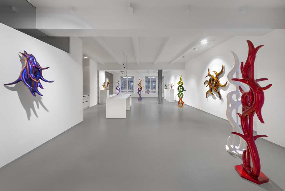 In the beginning was the blob. Curvy, sensual, full of colour. Shapeless and yet formative for the design of the turn of the millennium. Apple's iMac G3 or Nike's Triax watch are prominent examples of so-called "blobjects": tactile objects aesthetically inspired by organic shapes, manufactured using state-of-the-art technology, designed to trigger emotions. As a promise of beauty, pleasure and meaning that has become an object, blob design acts like a projection surface for desires and self-awareness. “Blobjects” stand for an attraction of form that translates directly into physical attraction. Fabian Bergmark Näsman's sculptures twine in pose like sci-fi plants. The invitation to touch seems implied. One could conquer the works like fitness equipment, excite them like playground architecture. They have the visual appeal of chrome nails and tuner cars - or that of a rose chafer. In the end, the futuristic color palette is just borrowed from nature. Bergmark Näsman witnessed the emotionalization of everyday objects as a driver of consumption at the end of the 90s. Aesthetically, the tech optimism before the dot-com crash flashes through in his work. He prefers manual work to industrial production. Behind the flawless surface of his art lies a sincere interest in the process of organic form finding. 2019 Bergmark Näsman made his first mold fragment. All elements of his sculptures are derived from this to this day. He multiplied the prototype with a silicone mold, trimmed and assembled the castings, developed them further - and reassembled them. And it hasn't stopped since then.