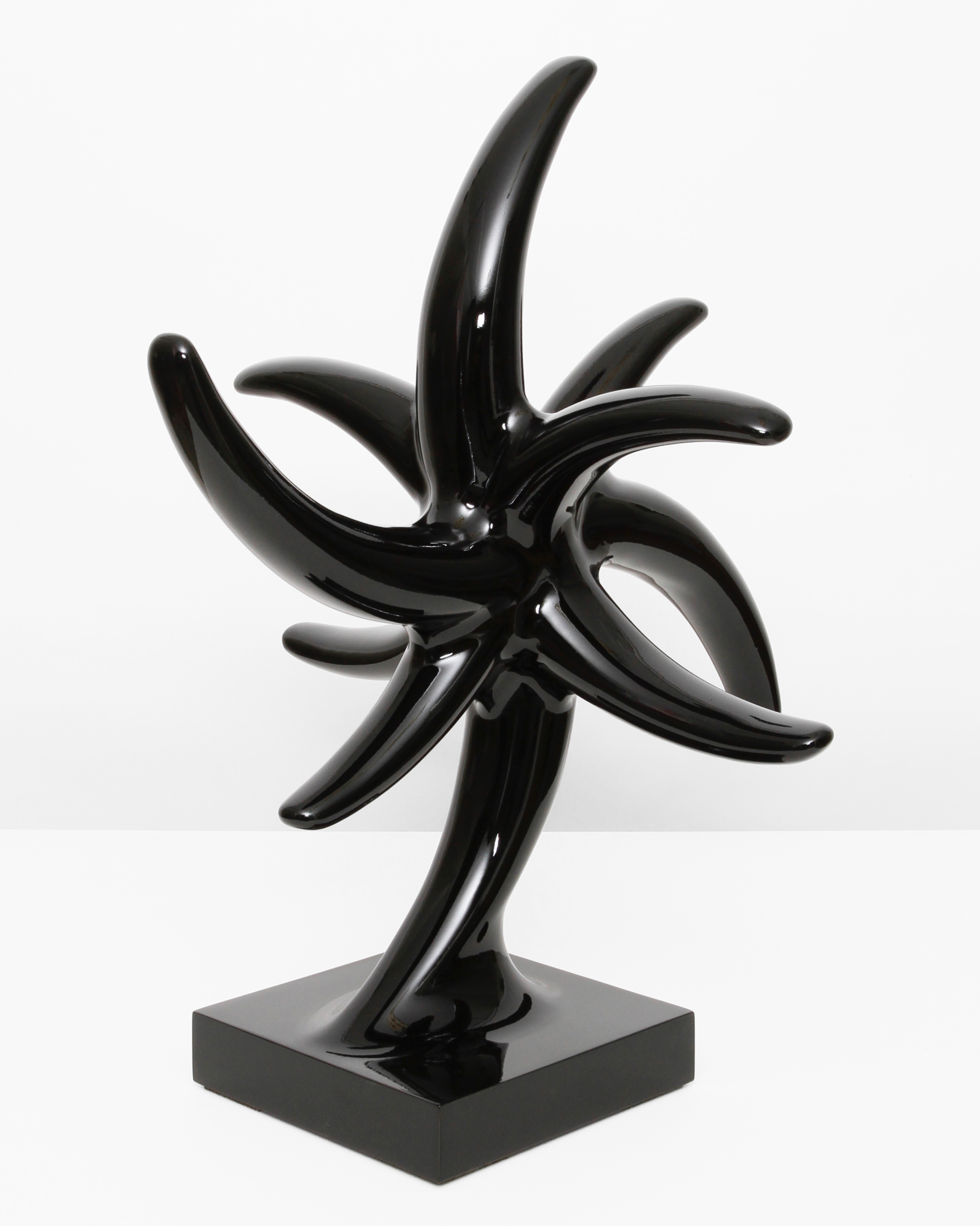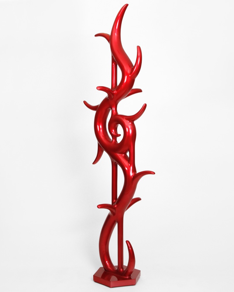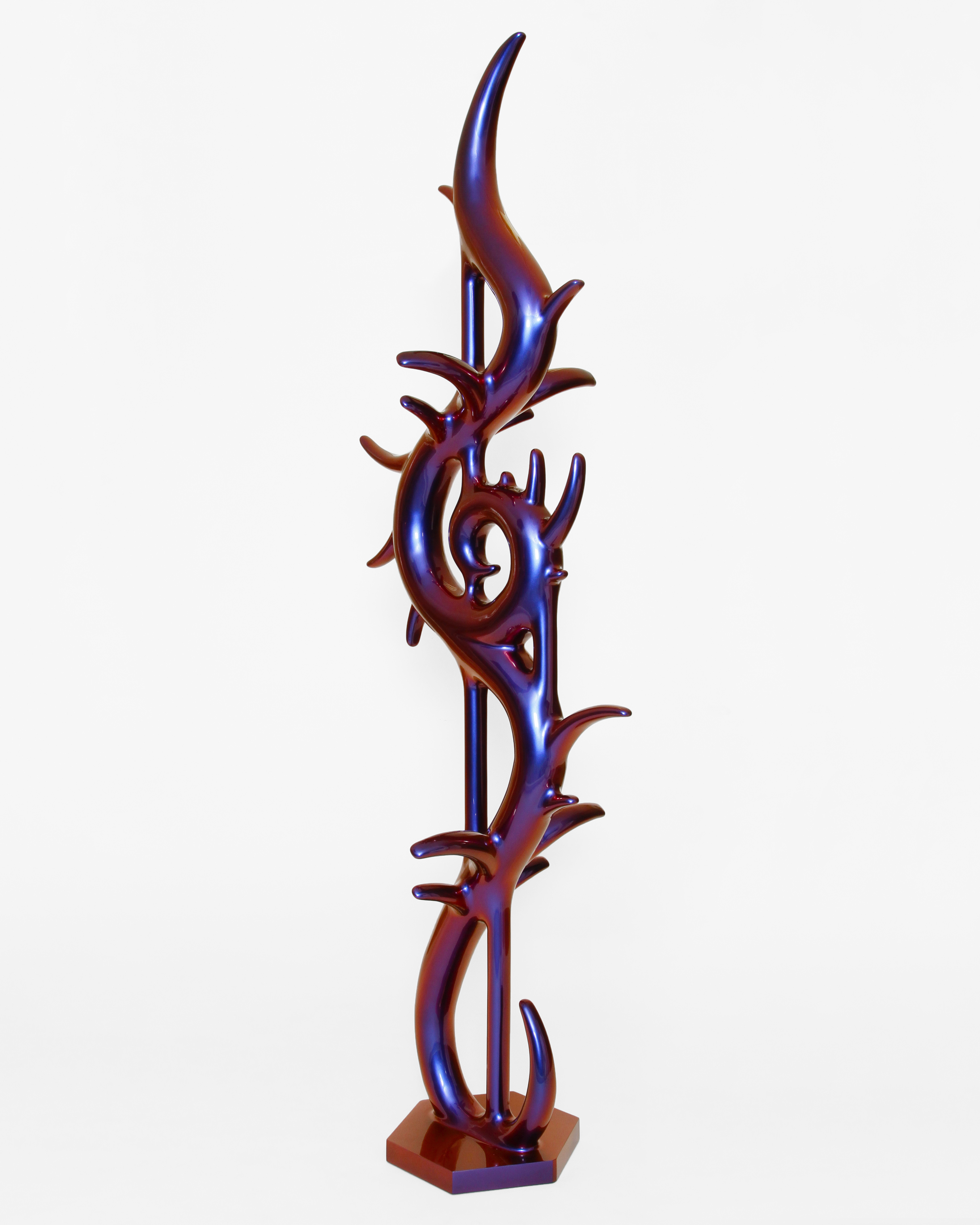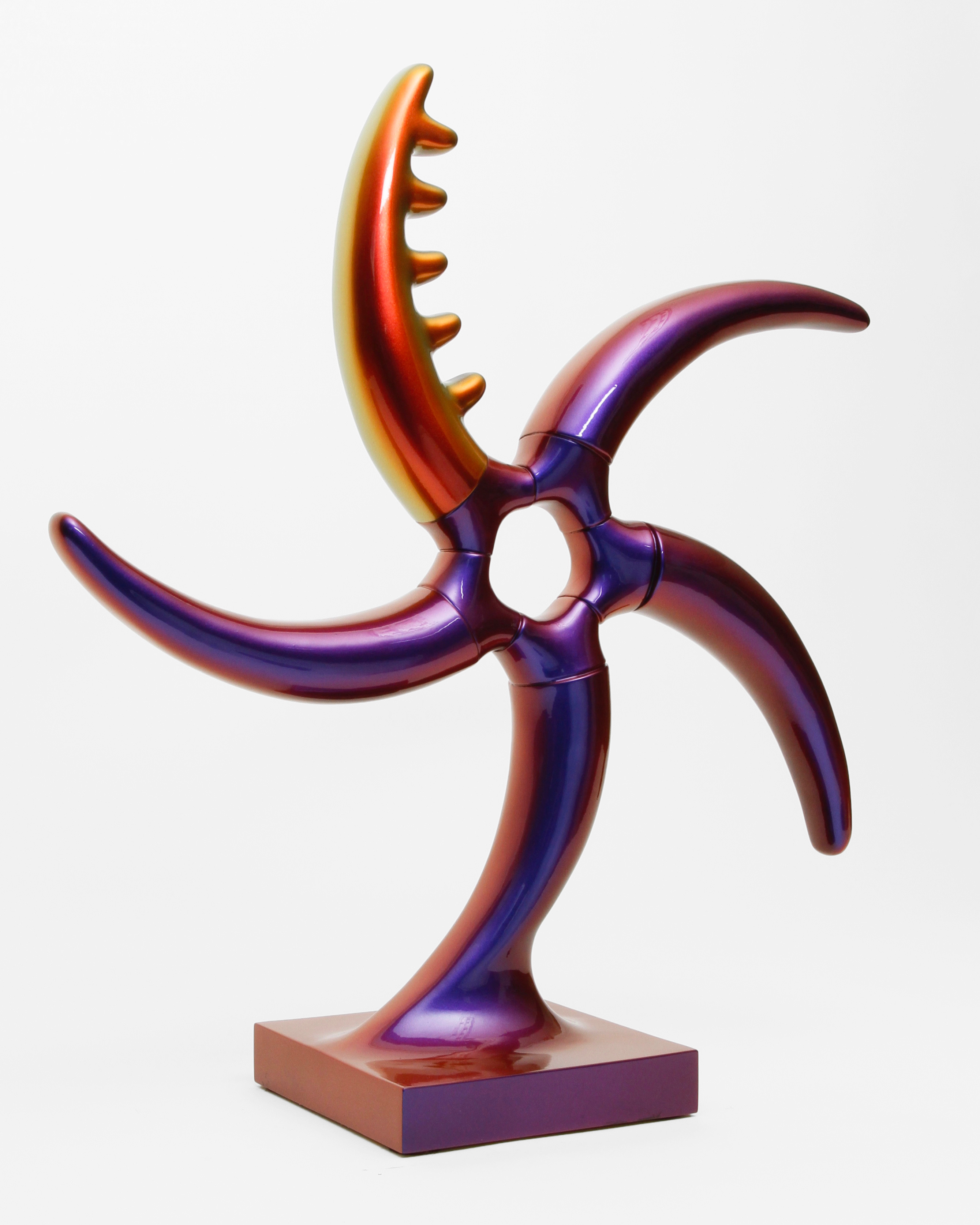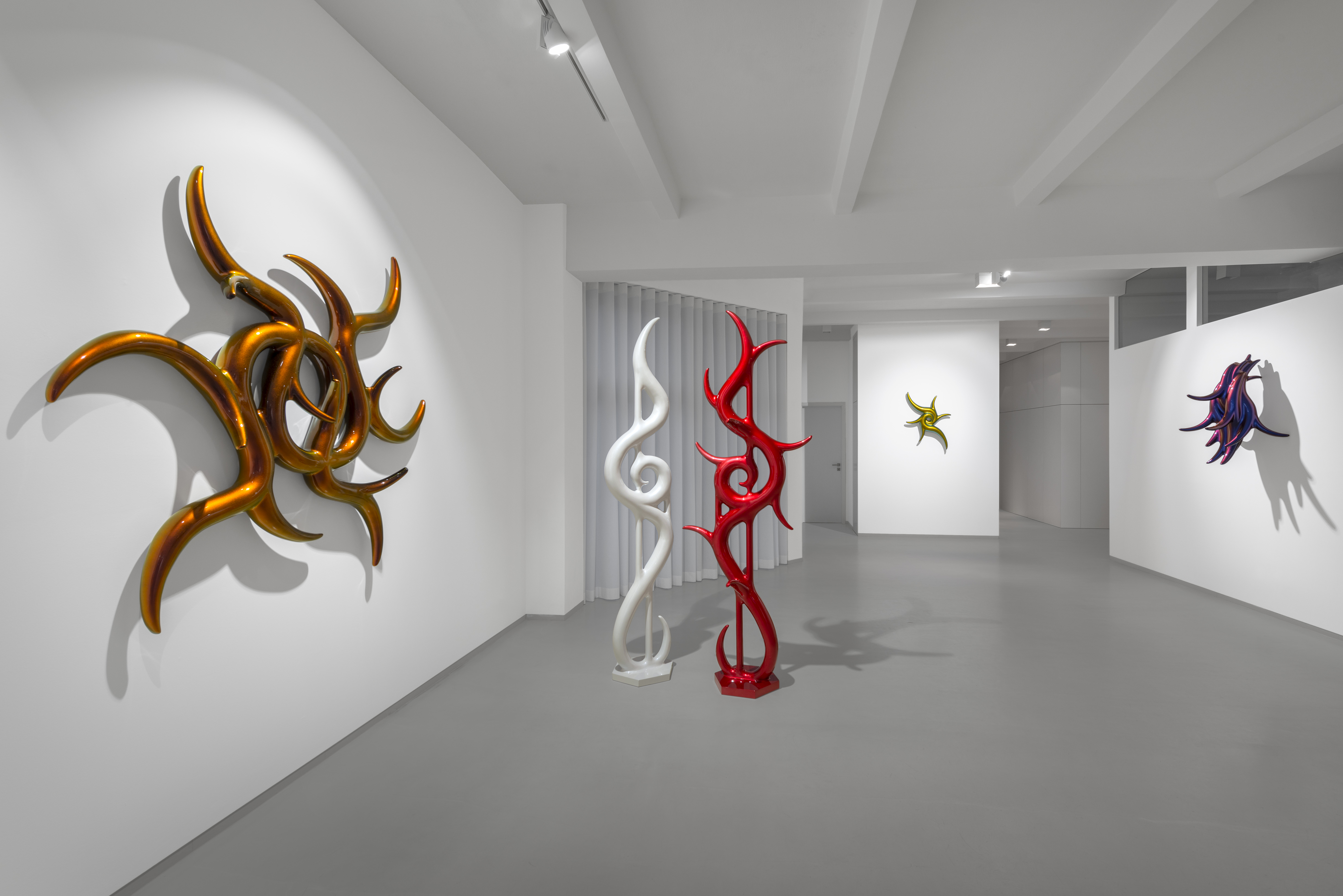 In the beginning was the blob. Curvy, sensual, full of colour. Shapeless and yet formative for the design of the turn of the millennium. Apple's iMac G3 or Nike's Triax watch are prominent examples of so-called "blobjects": tactile objects aesthetically inspired by organic shapes, manufactured using state-of-the-art technology, designed to trigger emotions. As a promise of beauty, pleasure and meaning that has become an object, blob design acts like a projection surface for desires and self-awareness. “Blobjects” stand for an attraction of form that translates directly into physical attraction. Fabian Bergmark Näsman's sculptures twine in pose like sci-fi plants. The invitation to touch seems implied. One could conquer the works like fitness equipment, excite them like playground architecture. They have the visual appeal of chrome nails and tuner cars - or that of a rose chafer. In the end, the futuristic color palette is just borrowed from nature. Bergmark Näsman witnessed the emotionalization of everyday objects as a driver of consumption at the end of the 90s. Aesthetically, the tech optimism before the dot-com crash flashes through in his work. He prefers manual work to industrial production. Behind the flawless surface of his art lies a sincere interest in the process of organic form finding. 2019 Bergmark Näsman made his first mold fragment. All elements of his sculptures are derived from this to this day. He multiplied the prototype with a silicone mold, trimmed and assembled the castings, developed them further - and reassembled them. And it hasn't stopped since then.
