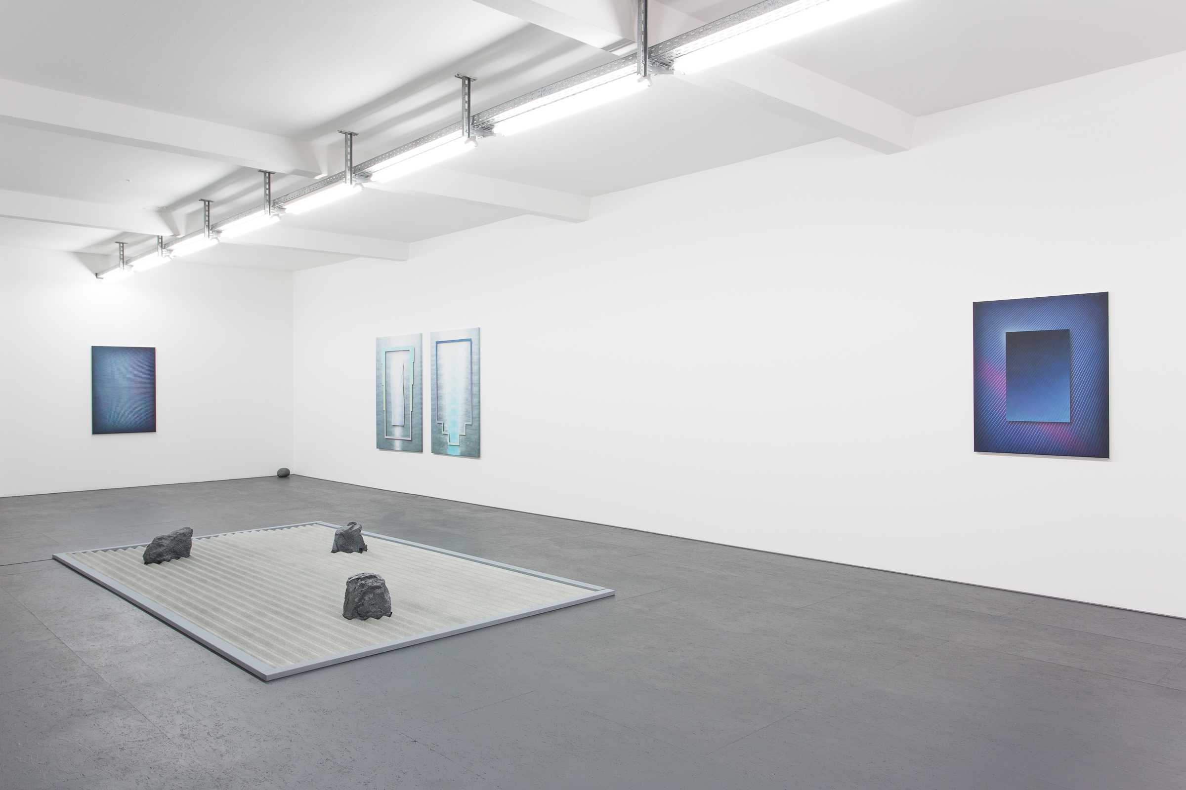 In *Atavistic Zen*, his fourth solo presentation at DUVE Berlin, Evan Gruzis considers the frame as subject within the transformation of his own process. Inspired by Dōgen Zenji, the Japanese Zen Buddhist teacher, Gruzis creates a unique body of work that explores the visualization of tension found in chaos and the more calculable wave form. *Atavistic Zen* showcases Gruzis's recent experimentation with materials.  Textile dyeing techniques are incorporated into his canvases and his works on paper reveal an acute focus on surface and texture. The sound sculpture, *Modulation Garden*, plays with the use of recording effects to create hypnotic overlapping rhythms that are both an aural counterpart to his paintings and an homage to Berlin's minimal dub techno tradition.
