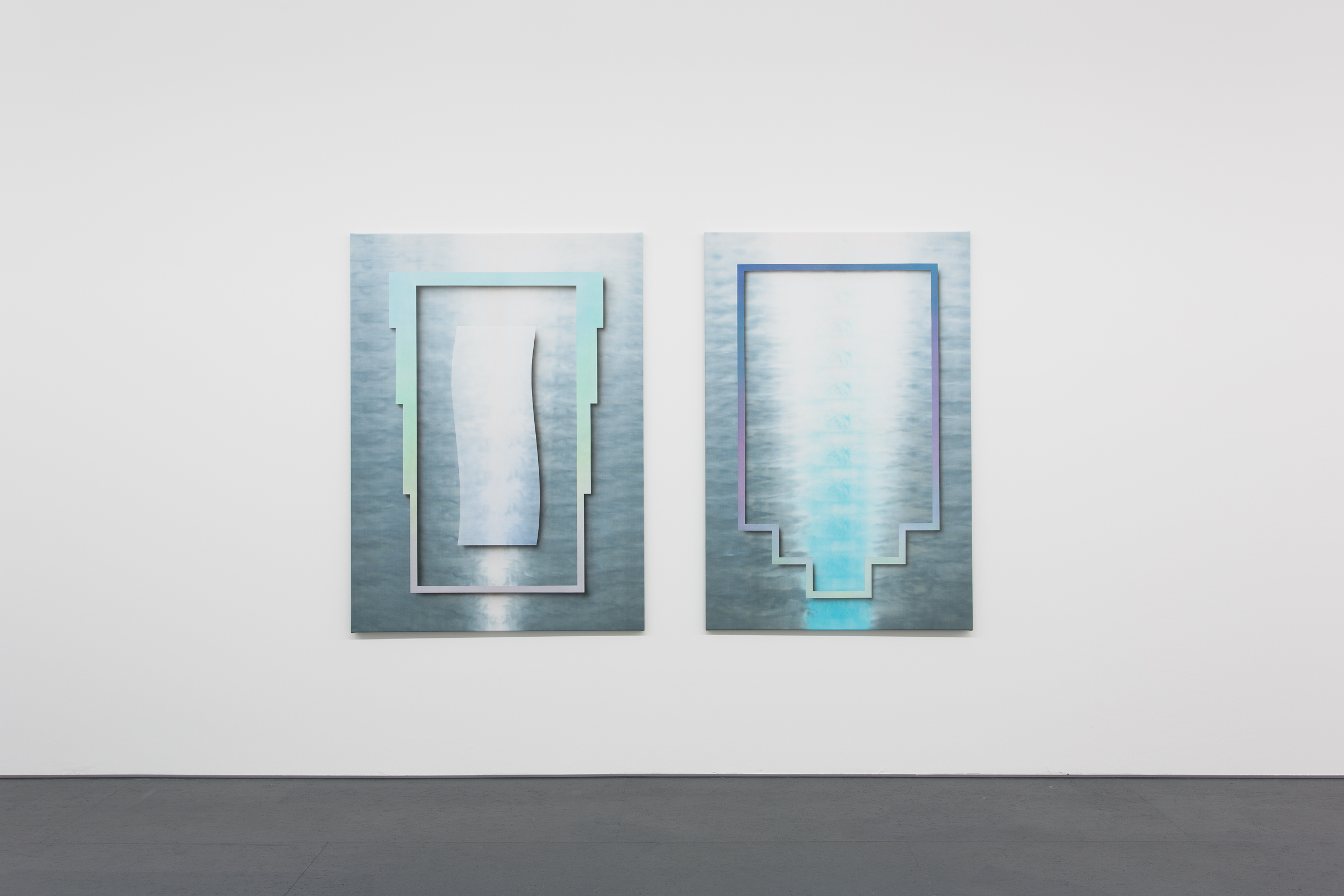 Gruzis's new dye paintings paradoxically combine ubiquitous themes such as the frame within a frame and the repetition of gesture through complex craft.  By dyeing some of his canvases, he is recognizing the fabric as an object in and of itself –  a temporal sculptural intervention in his process.  The result is a substrate that appears to contain an artifact of the manufactured, something produced without conscious thought.  This relationship to objecthood and artifice is then made explicit with Gruzis's painted-on borders and floating rectilinear passages that exploit art's most basic tropes.