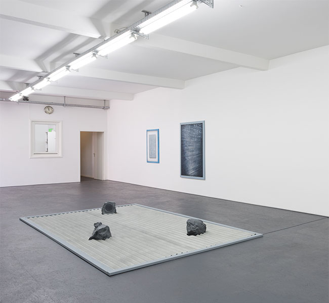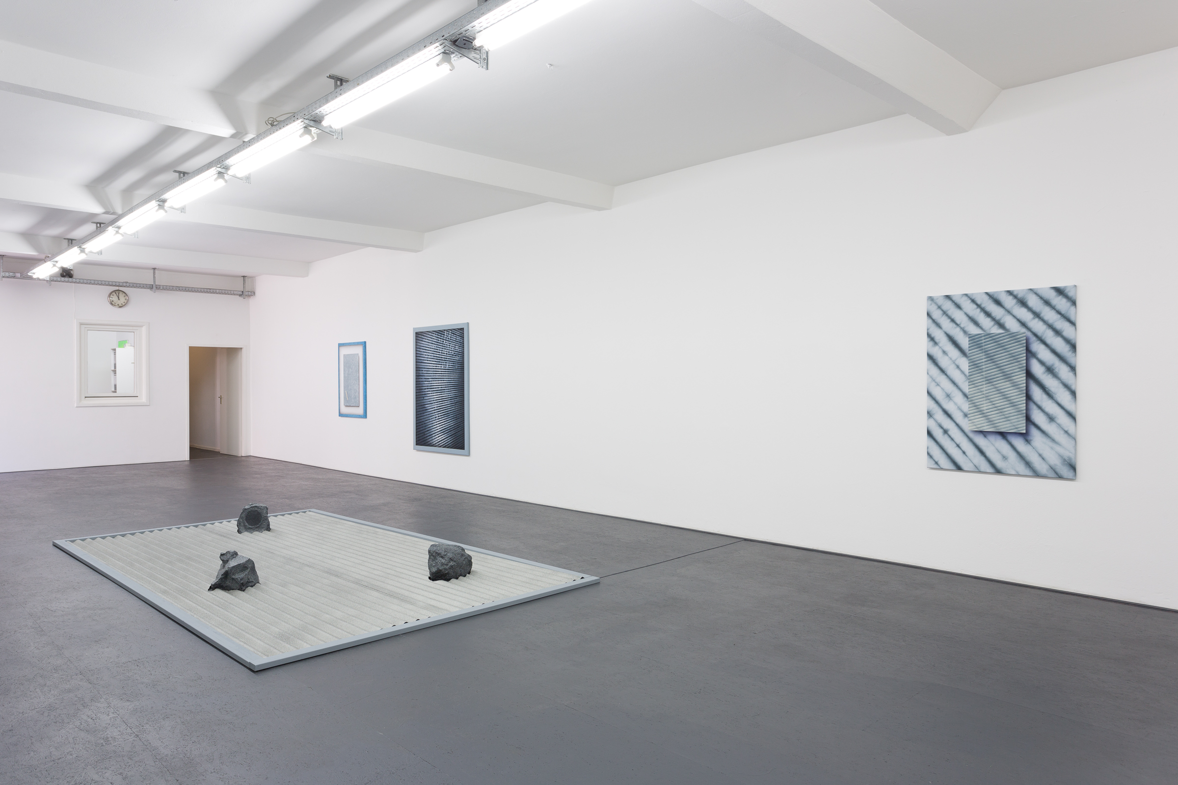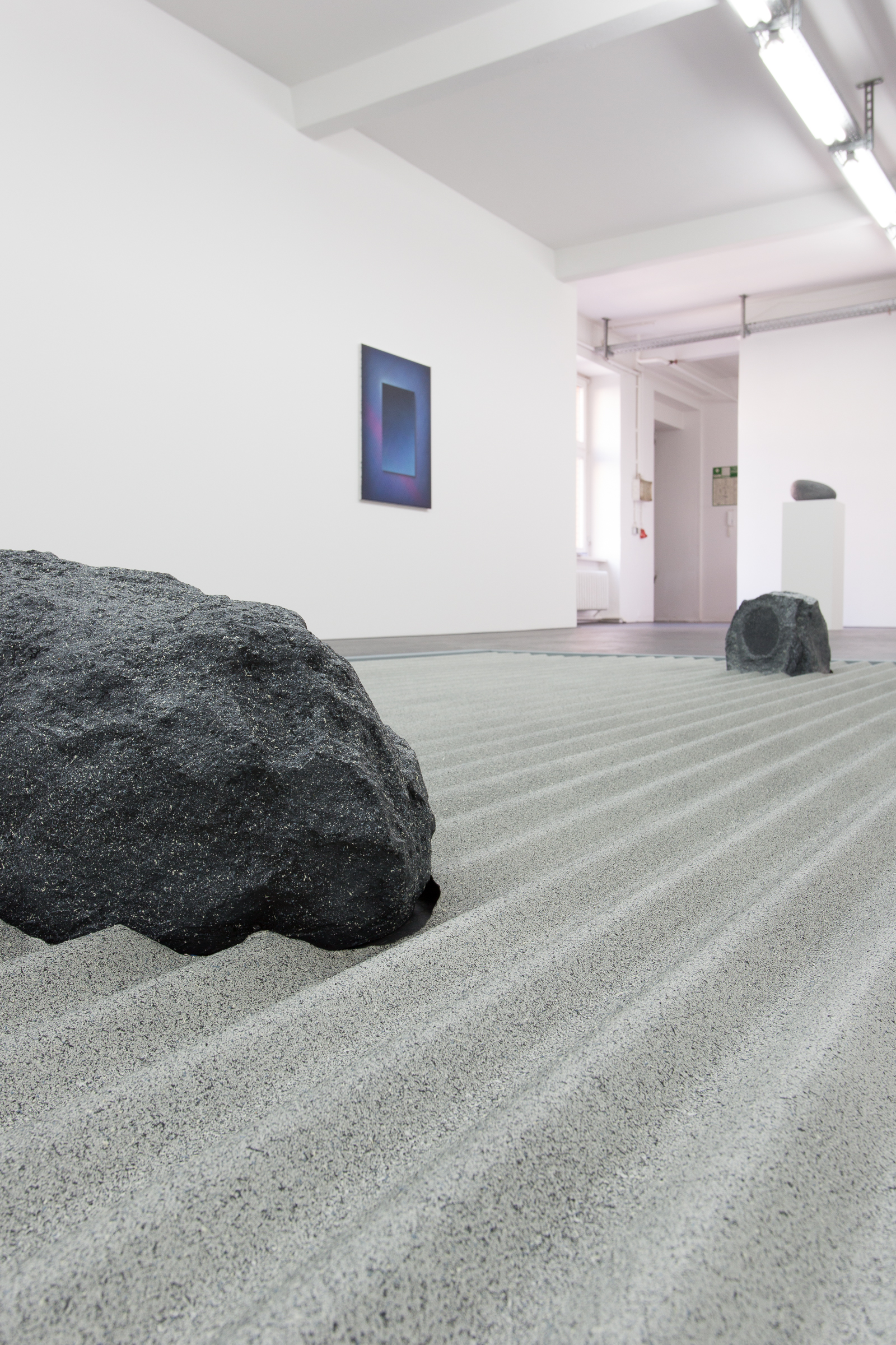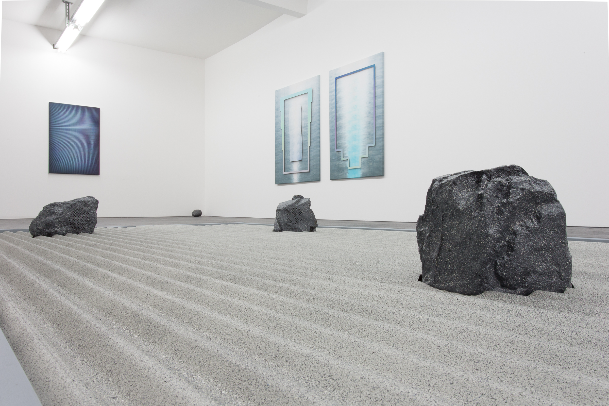 Mit *Atavistic Zen* präsentiert Gruzis auch seine neuesten Materialexperimente. Zusammen mit seinen Papierarbeiten zeugen die Textilfärbetechniken, wie sie hier auf seine Leinwände angewandt sind, von einer intensiven Fokussierung auf Oberfläche und Textur. Die Klangskulptur *Modulation Garden* mit ihren hypnotischen, überlappenden Rhythmen spielt mit dem Einsatz von Aufnahme-Effekten und ist sowohl ein akustisches Gegenstück zu seinen Bildern, als auch eine Hommage an die Berliner Minimal Dub Techno Tradition.