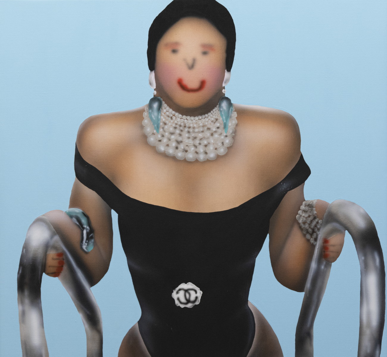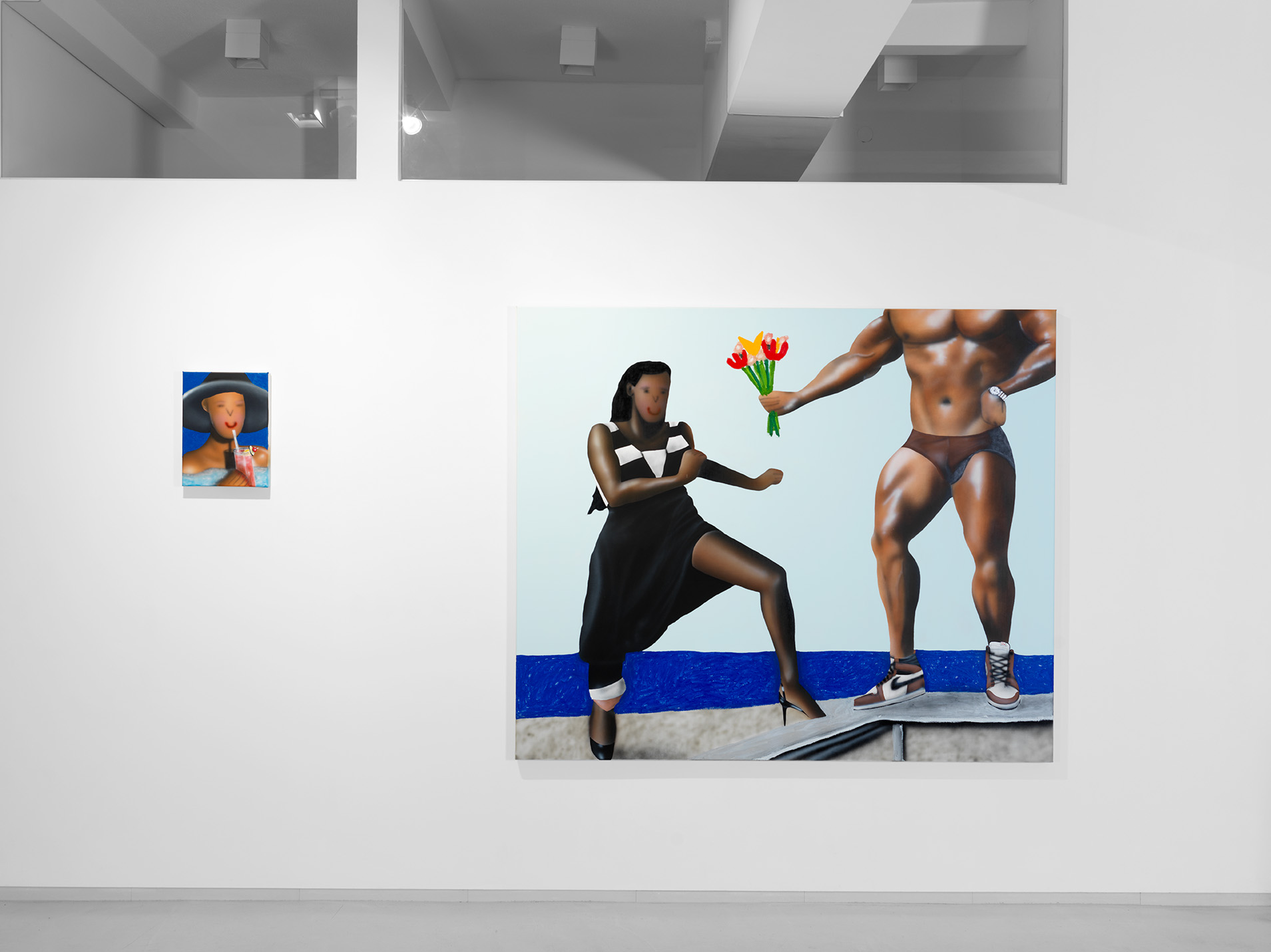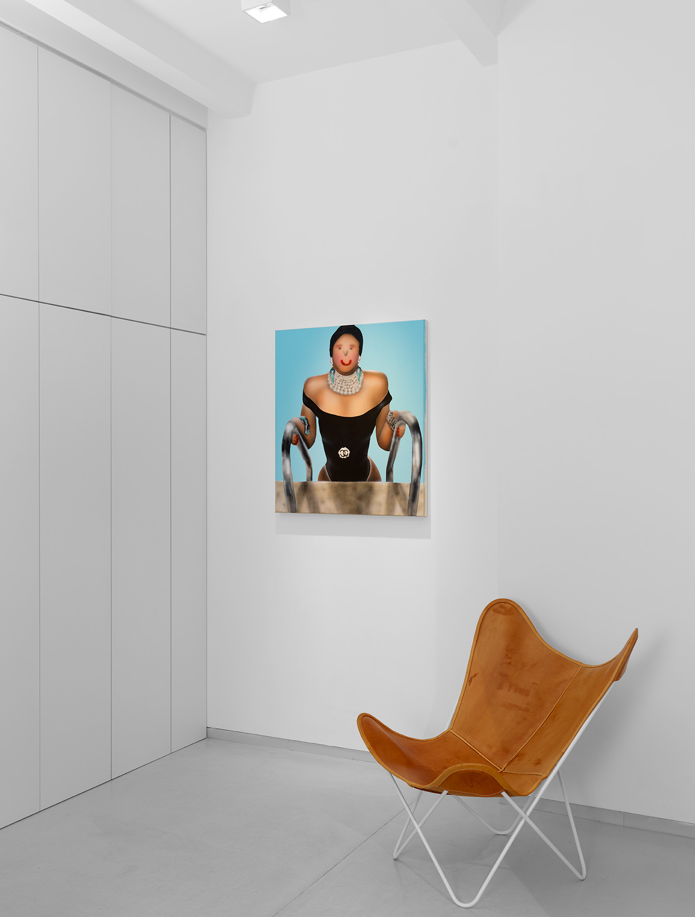 In a world where no one moves in the art scene without being on Insta anymore and some older spirits among us are afraid of TikTok taking over (oh no, not another new platform please) it does not come as a surprise that Contemporary Art came to adapt its aesthetics. Post-digital, post-internet, post contemporary? One of the hottest things in painting right now is the substitution of hair with air: the brush digitized to air-brush. Needless to say that EVGEN’s got that going for him too. Which is nice because it serves his interest in surfaces and plasticity. In his works, strongly elaborated figures are often in relief against a radically plain and simple background. It almost seems like the foreground was cut out of an image with the lasso tool and photoshopped into the painting. This contrast causes the eye to focus – unfocus like the objective of a camera trying to sharpen an image. The artist’s work has been described as »faux-naif«, its content being referred to as »contemporary absurdities«.