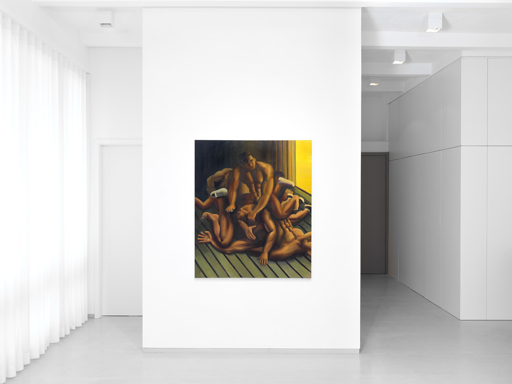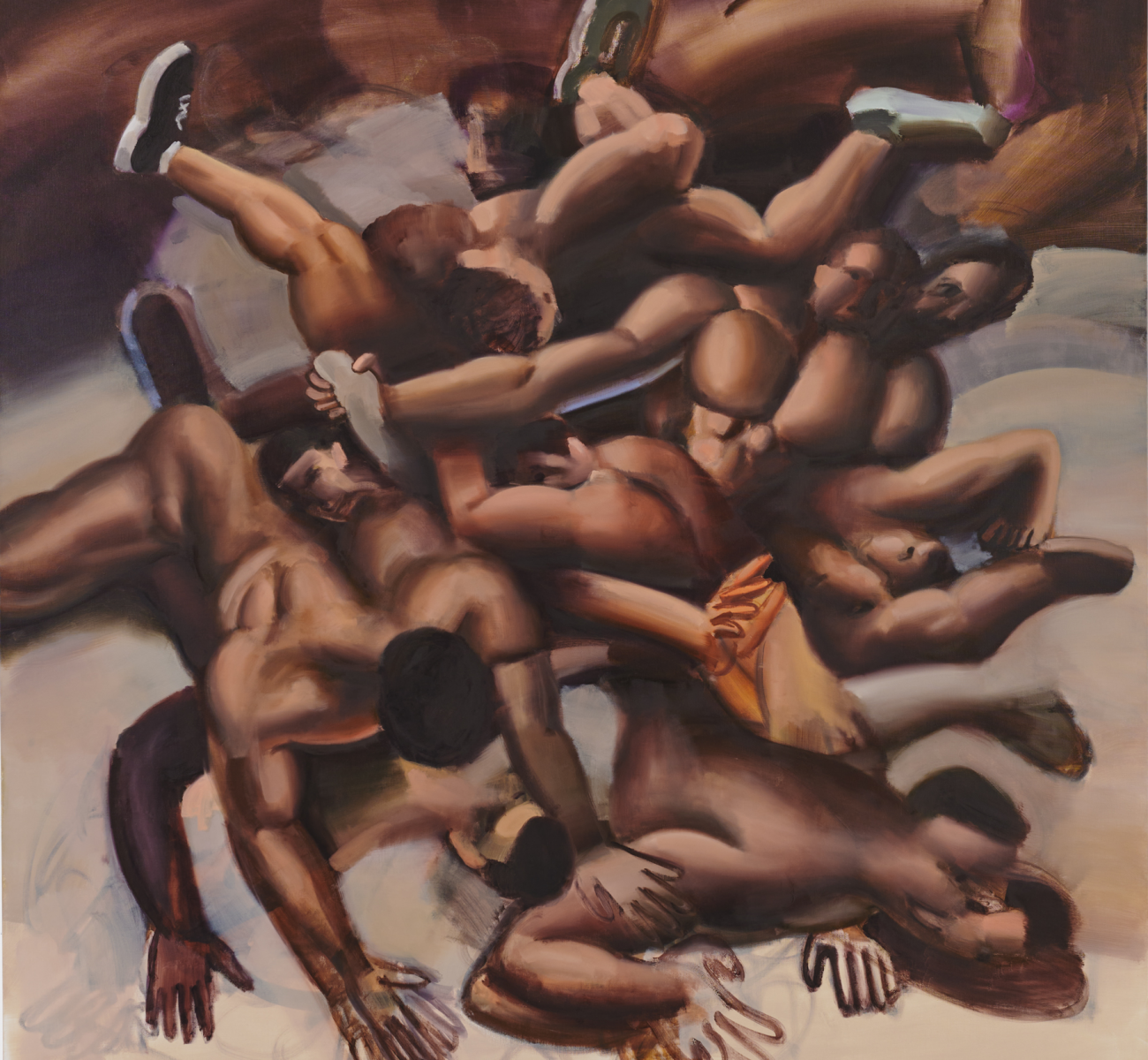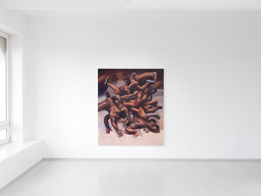 Oenen also breaks new ground formally with his heap paintings. He breaks away from the earlier severity and flatness of the composition. The only background is a color space or the bare canvas - at most the impression of a sky is recognizable - the gaze is directed centrally to the male bodies. The dynamics and rhythm of the structure of the figures stand out and could suggest anaffinity with Rubens, Delacroix or Tintoretto, who structure the pictorial space through geometry, or are based on the figura serpentinata.
