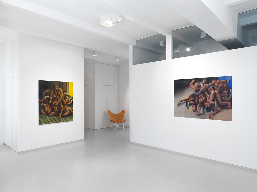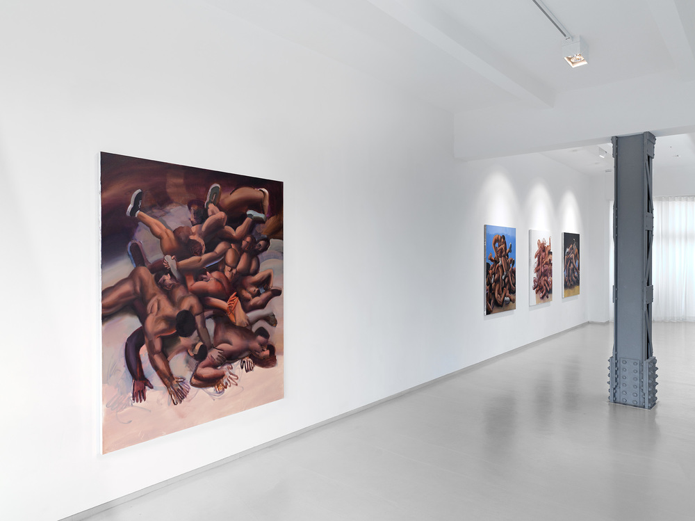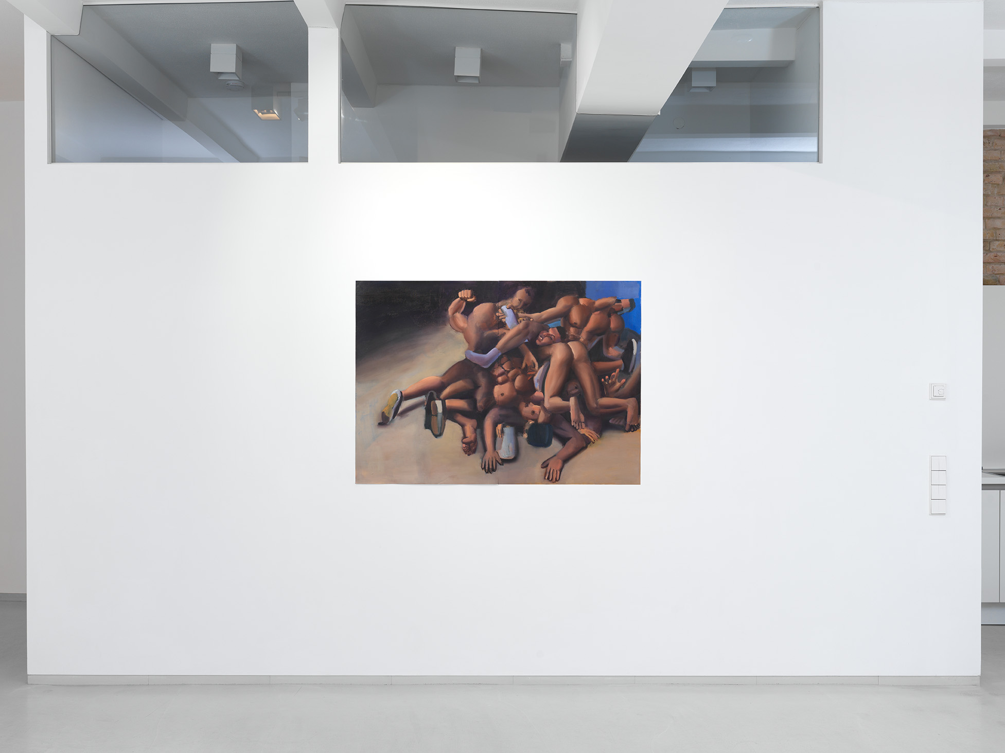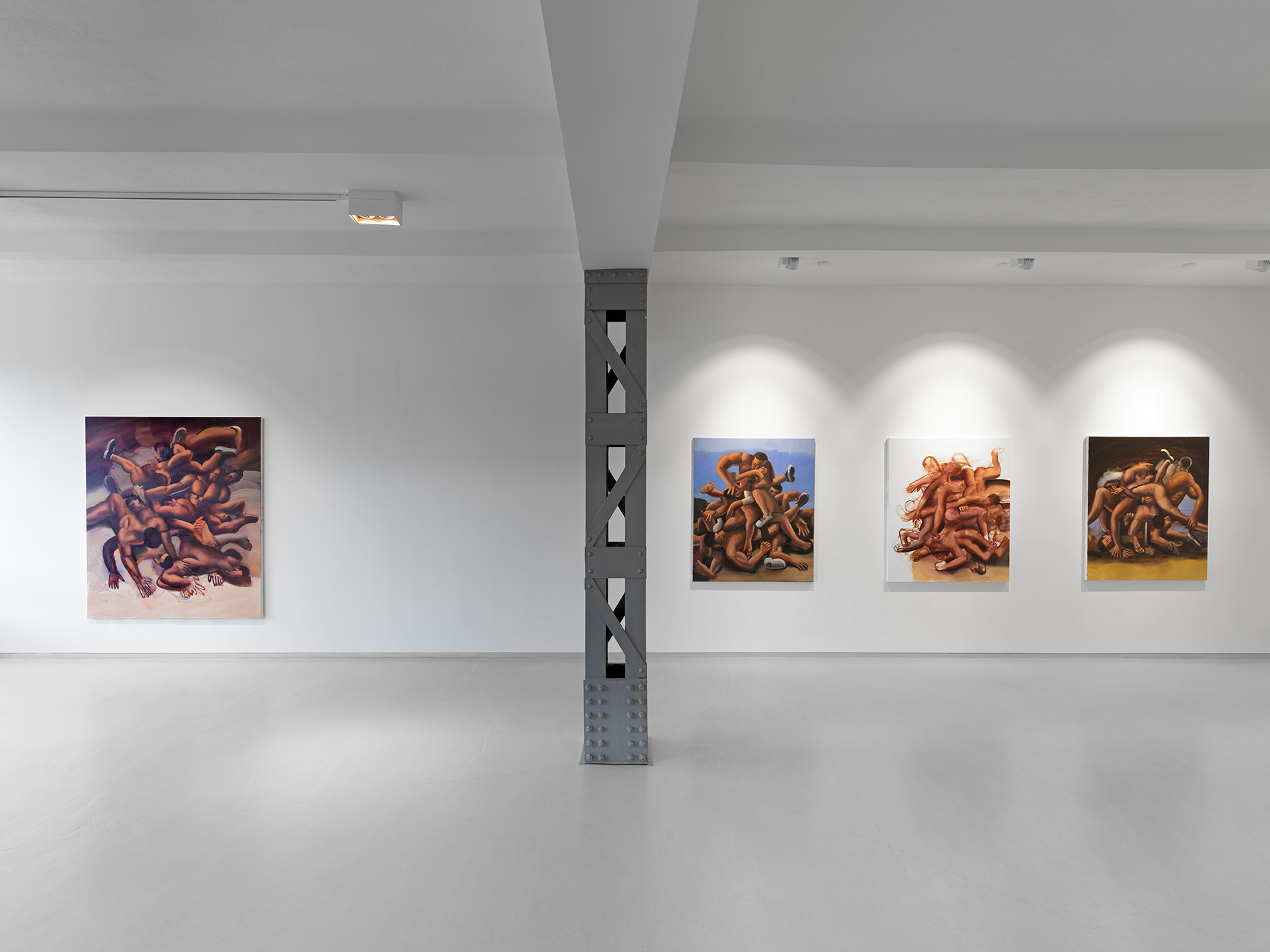 In his new group of works, Oenen leaves these references and turns toward a more psychological and formal direction. In terms of content, there is still a reference to the male body, but this is no longer the subject of a special situation. The bodies merge into ever more abstract heaps or mountains of bodies. It's about rhythm, erotic physical movement, impulsiveness, but now also about violence and dominance. The individual becomes part of a whole and seems to rise or fall in it. These works are a logical continuation of the question of masculinity raised in earlier groups of works, which on the one hand oscillates in its form between sexual attractiveness and being driven. On the other hand, Oenen also asks himself whether he can or wants to detach himself from this image of masculinity - a detachment process that leads to disorientation and aggression. Dilemma or ambiguity, this question remains open.