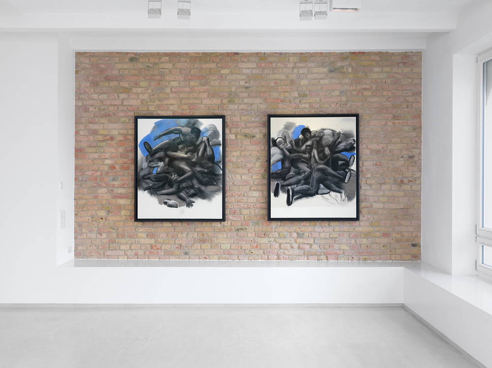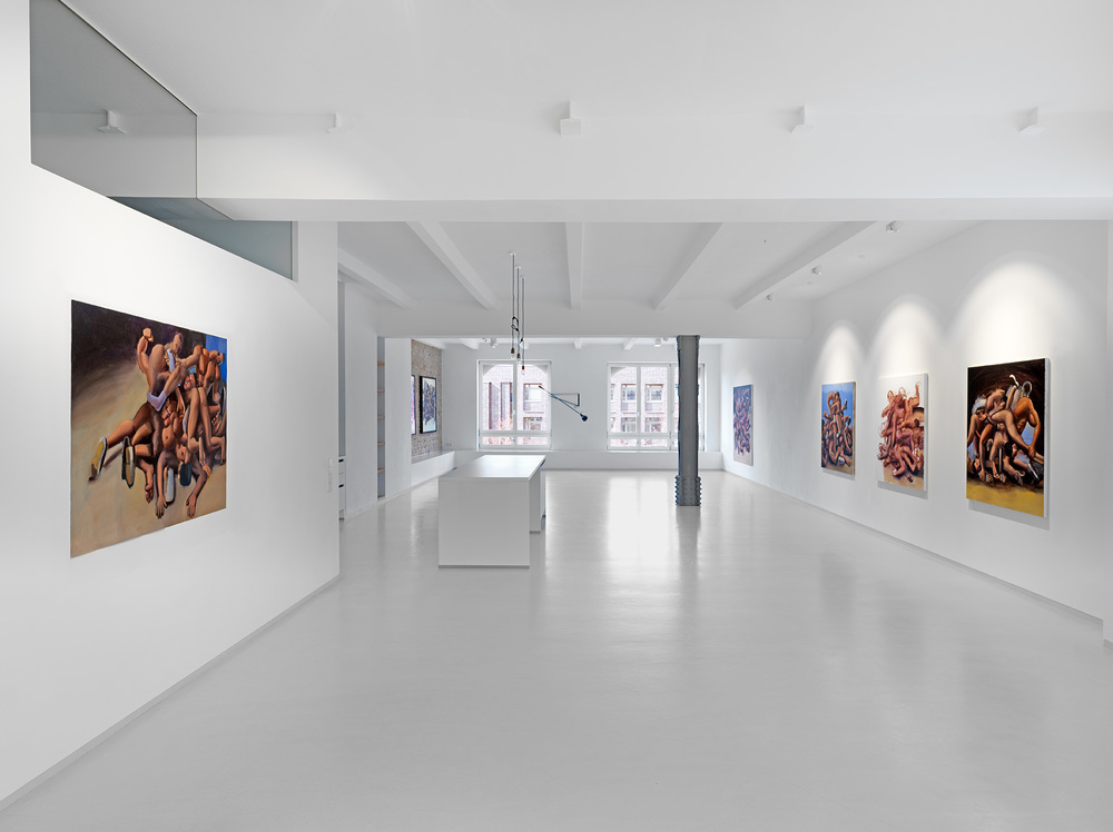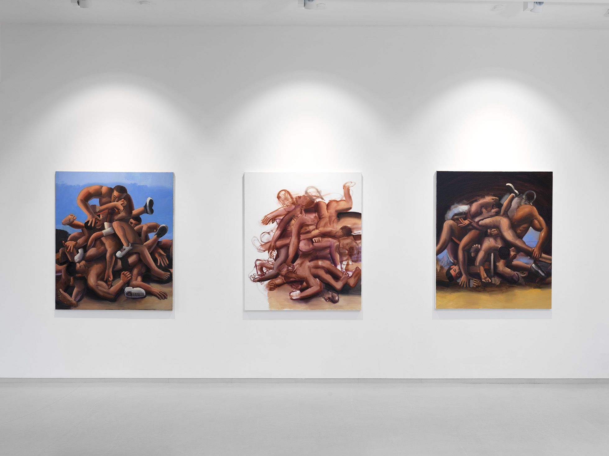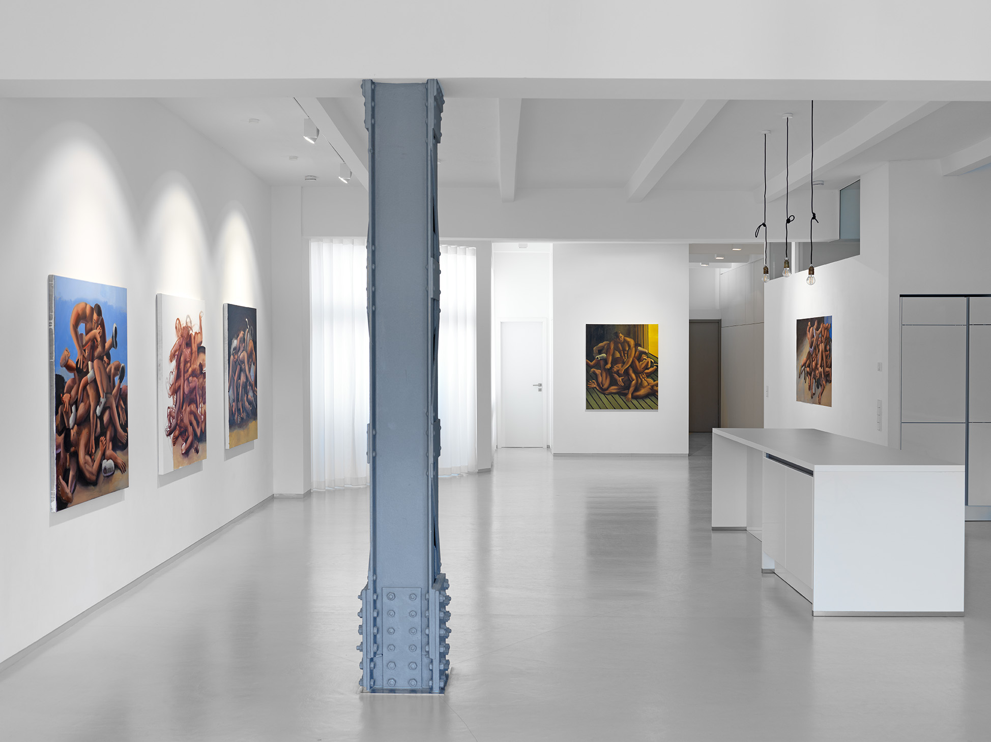 In his new group of works, Oenen leaves these references and turns toward a more psychological and formal direction. In terms of content, there is still a reference to the male body, but this is no longer the subject of a special situation. The bodies merge into ever more abstract heaps or mountains of bodies. It's about rhythm, erotic physical movement, impulsiveness, but now also about violence and dominance. The individual becomes part of a whole and seems to rise or fall in it. These works are a logical continuation of the question of masculinity raised in earlier groups of works, which on the one hand oscillates in its form between sexual attractiveness and being driven. On the other hand, Oenen also asks himself whether he can or wants to detach himself from this image of masculinity - a detachment process that leads to disorientation and aggression. Dilemma or ambiguity, this question remains open.