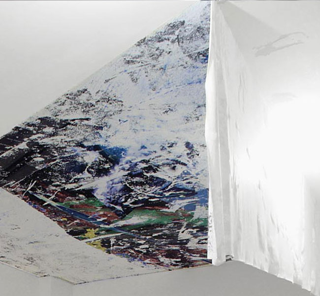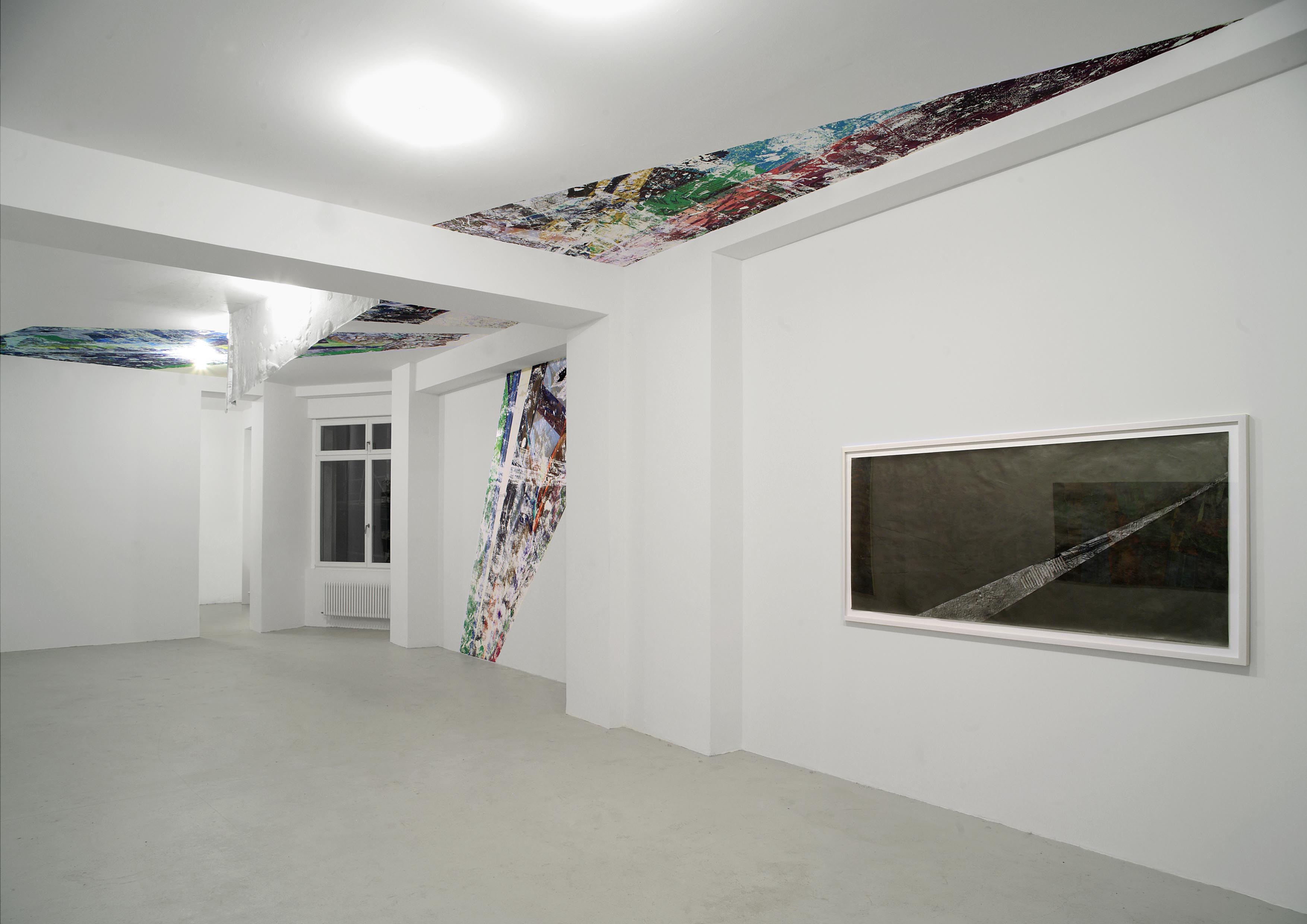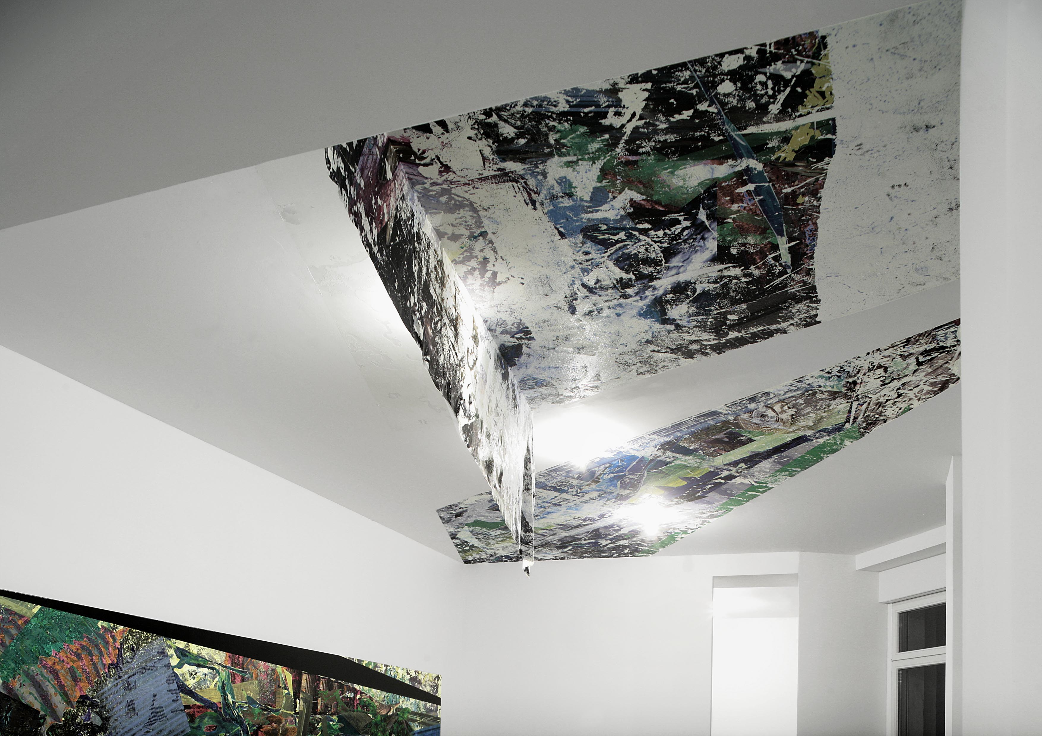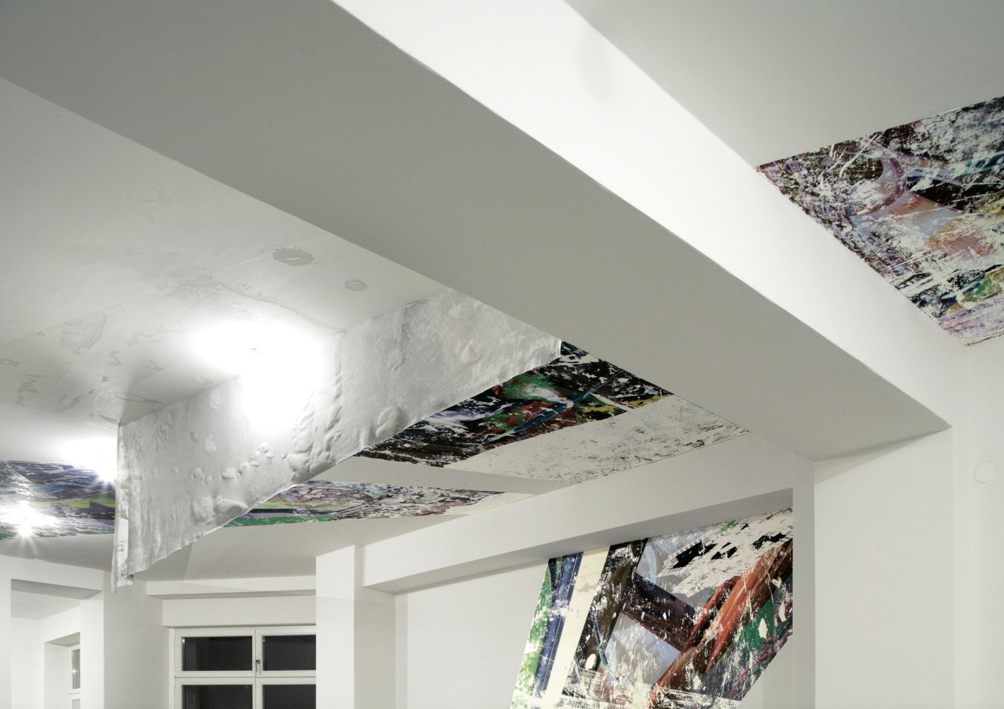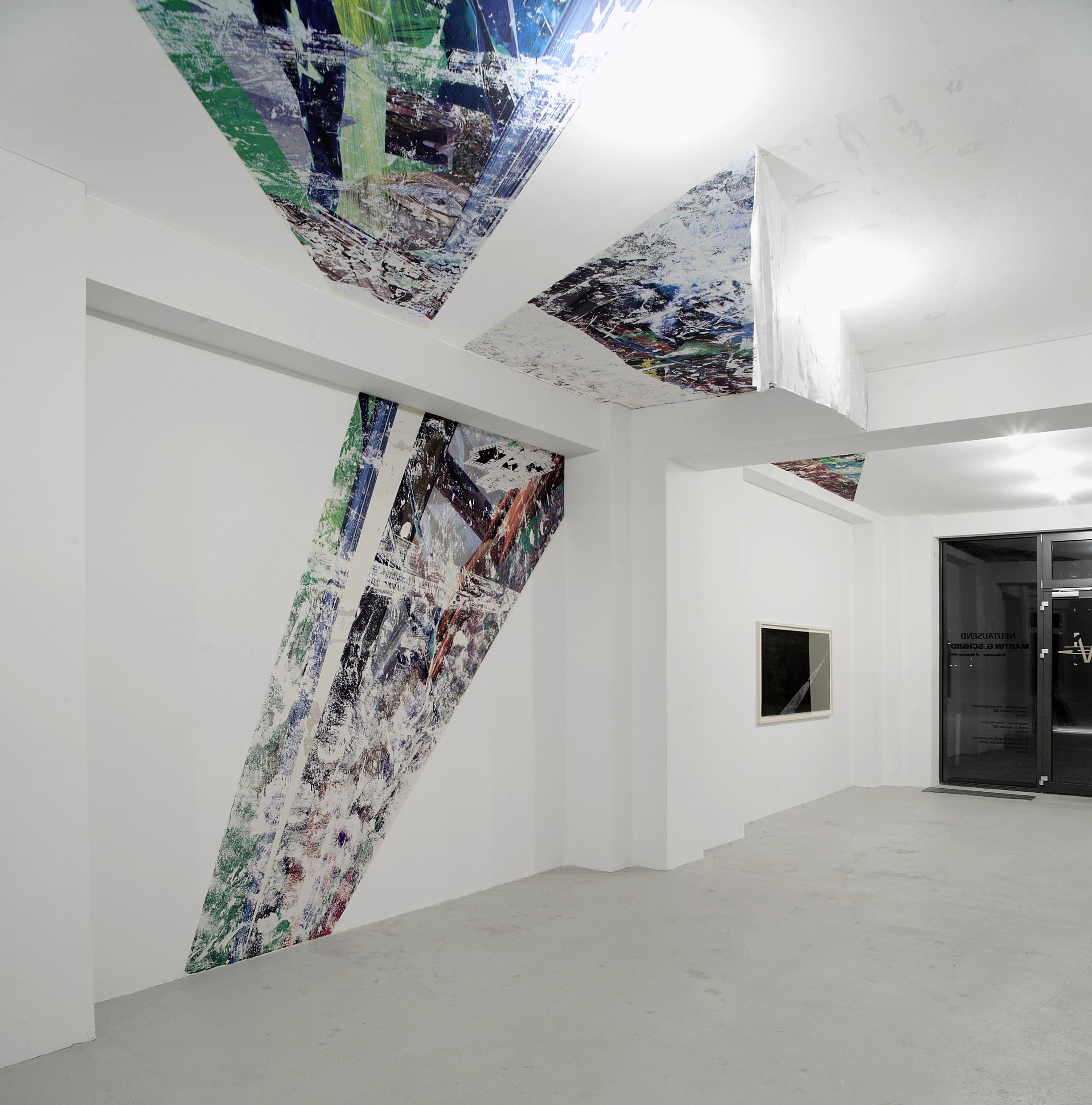 Durch die stetige Erfindung neuer technischer Verfahren bewegt Schmid sich in seinem Werk vom immateriellen Computer hin zum materialisierten Bild. Über die Kombination von Druck, Collage und Malerei erstellt Schmid zweidimensionale, raumgreifende Wand-Deckeninstallationen aus denen seine Tafelbilder und Arbeiten auf Papier abgeleitet sind. Verschiedene Arbeitsansätze verwendet er additiv, so dass wir in der Ausstellung gleichzeitig Secco und Tafelbild in Bezug zueinander antreffen. In NEUTAUSEND sind alle Arbeiten speziell für die vorhandene Raumsituation konstruiert. Schmid verleiht somit dem Thema Simulation eine weitere Dimension.