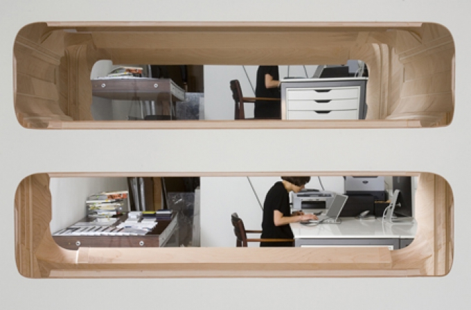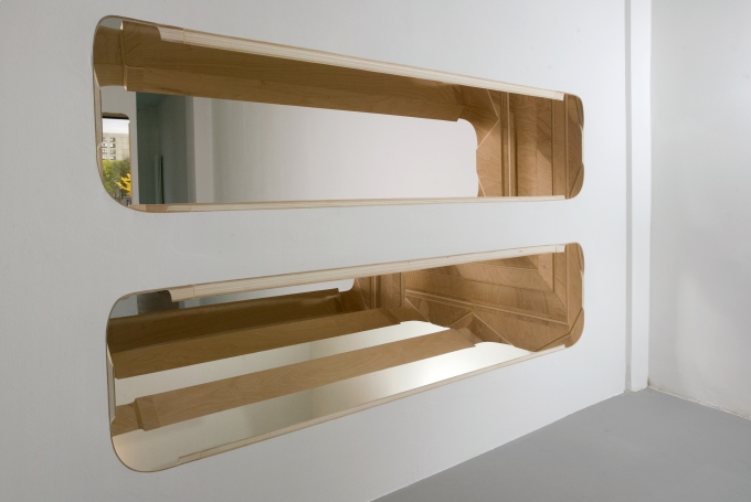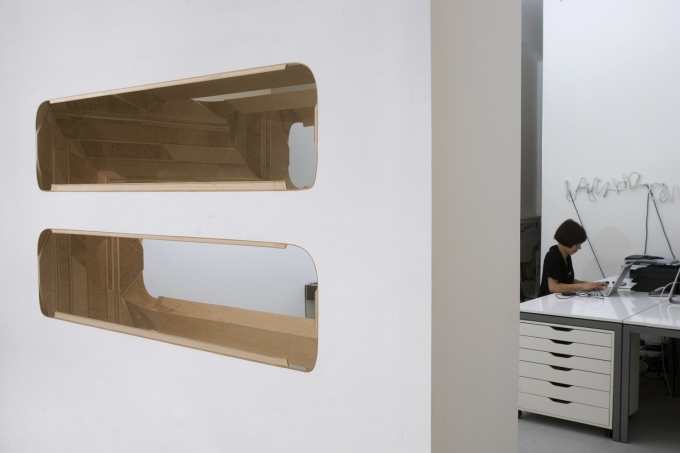 At Duve Berlin, Oppenheimer further develops her investigation into lines of sight in a mode of seeing she calls “self conscious voyeurism“. *P21 x P41* is a mirror enhanced geometric aperture inserted into the walls of the gallery. This architectural periscope reflects and multiplies sight lines. It exposes scenes not usually visible to gallery visitors. The viewer can peer into the private office area and beneath the desks of gallery staff. Unlike the cinematic gaze, the relationship between the viewer and the observed is reversible: the observed can look back at the viewer.
