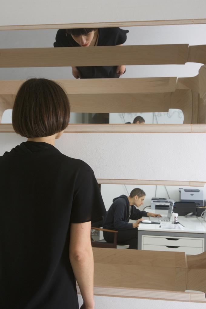 Oppenheimer’s work evolves from an engagement with space through sensory perception and social interaction. Visual perception and bodily movement are central to her practice; through her architectural interventions a cinematic experience of space is created.