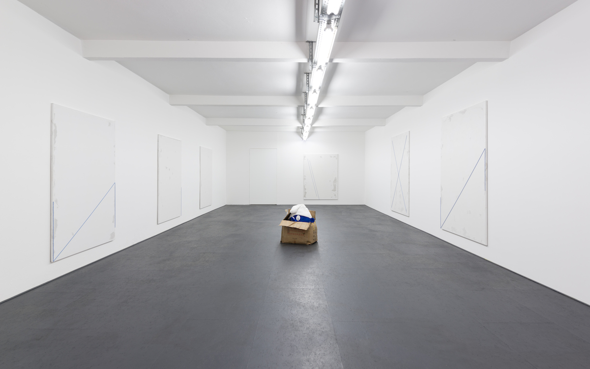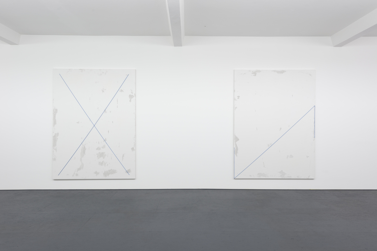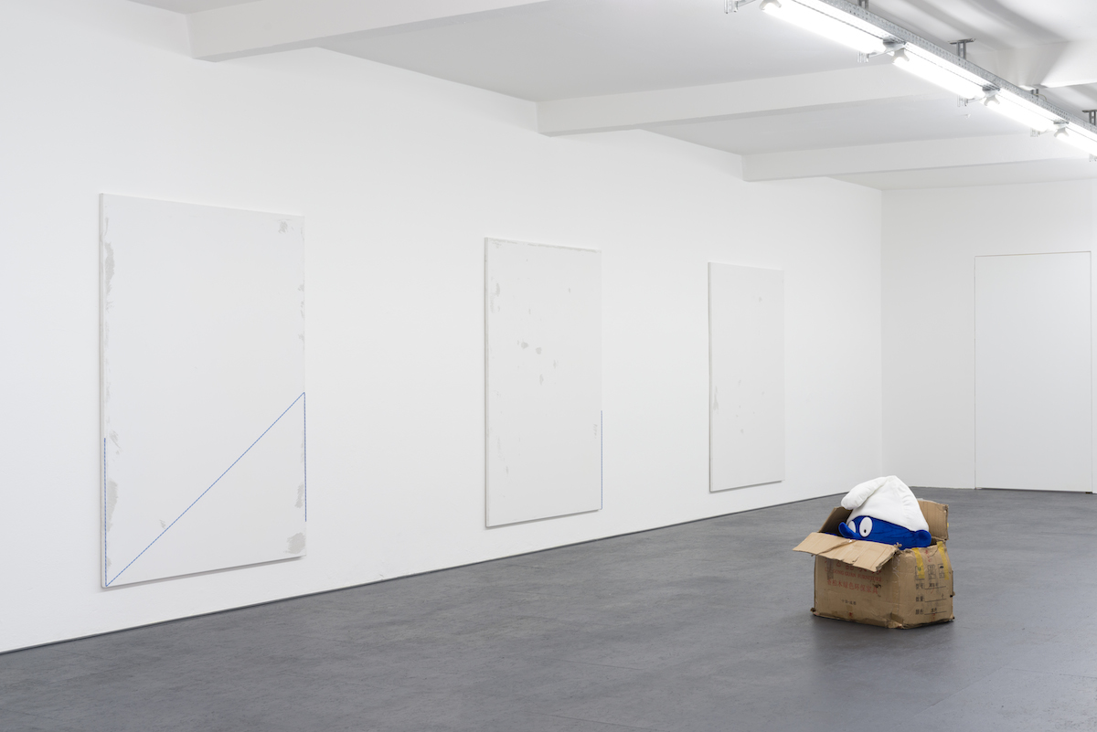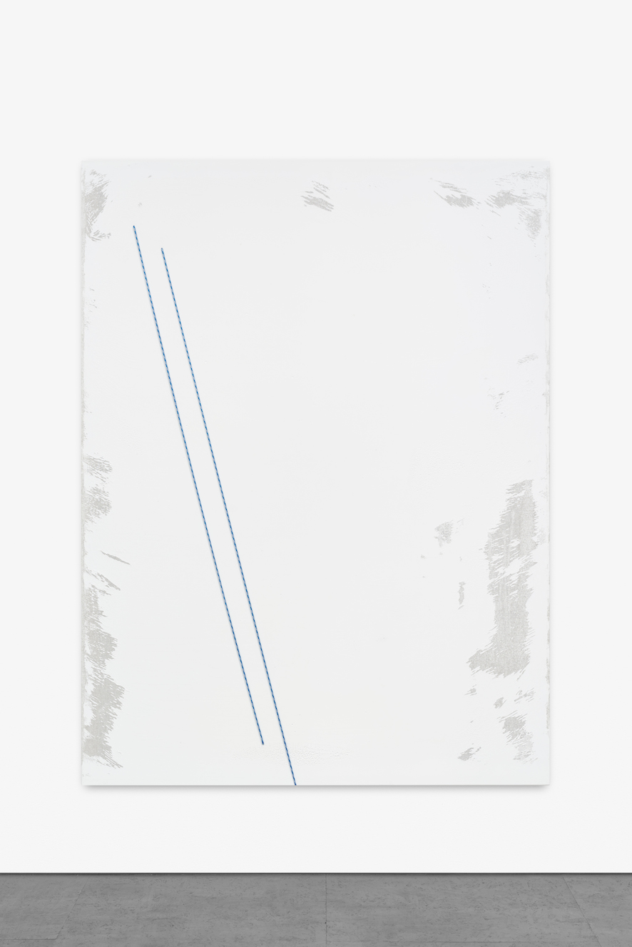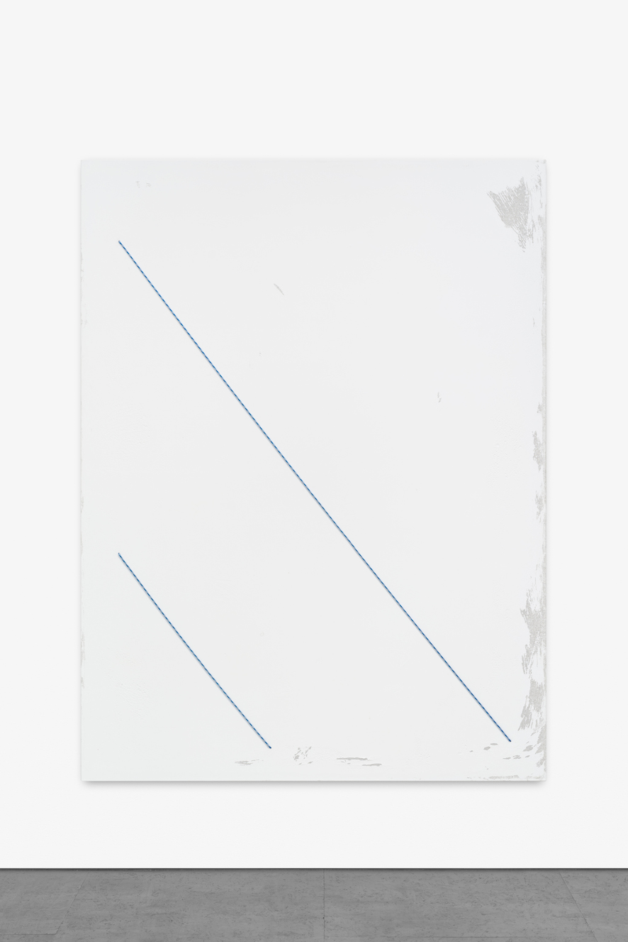 Jens Einhorn's new body of work, presented in Berlin for the first time, consists of a series of white, monochromatic paintings. Lengths of blue rope, subtly placed onto the surface of each of the canvases, act as a Leitfaden - a running thread - through which the works are simultaneously differentiated and tied together as a whole. Alternately evoking constraint and movement, they attempt to redefine and renavigate the space of the canvas, thereby mimicking the infinite possibilities of our own movement within space.