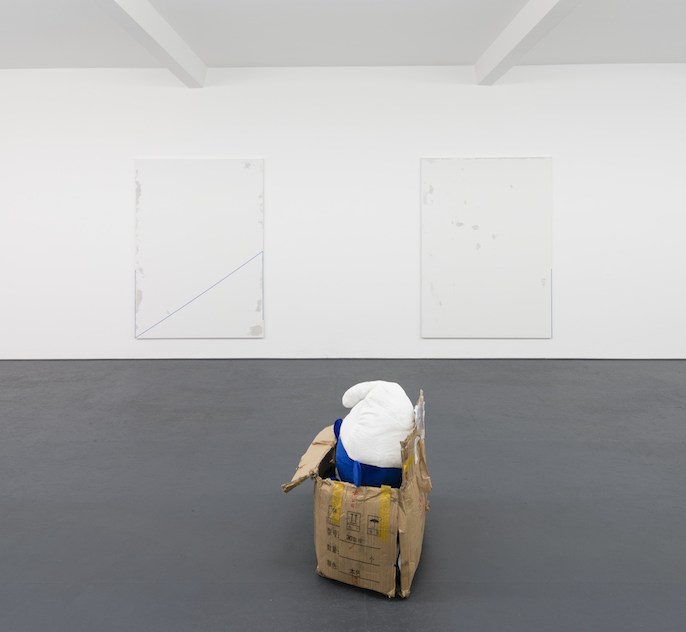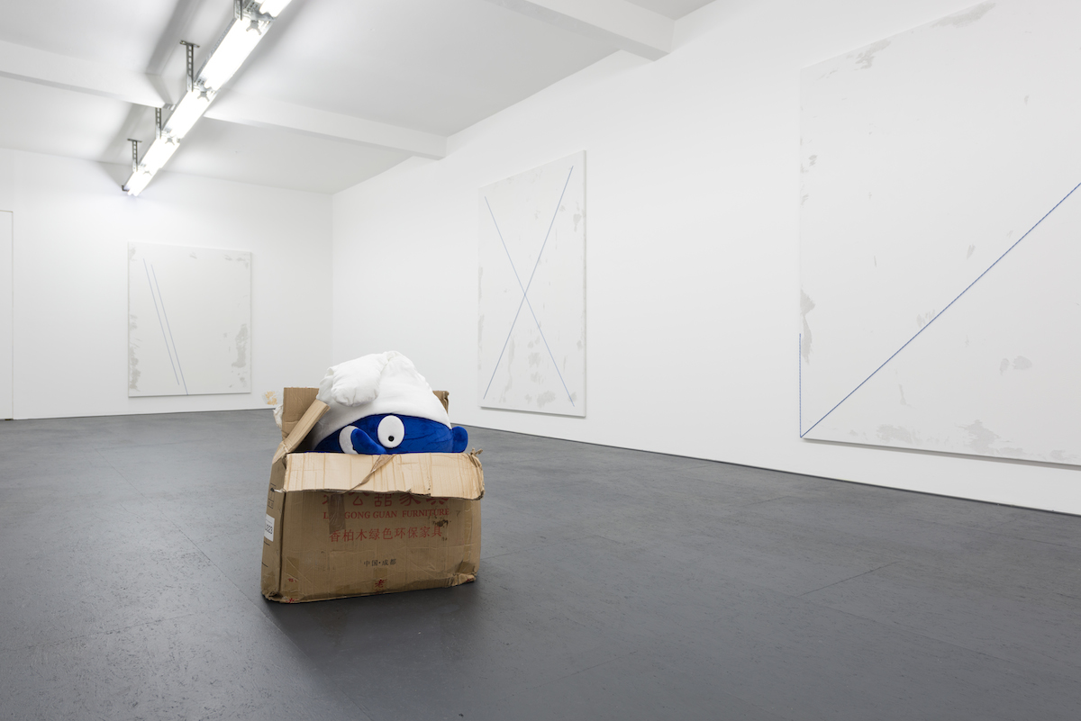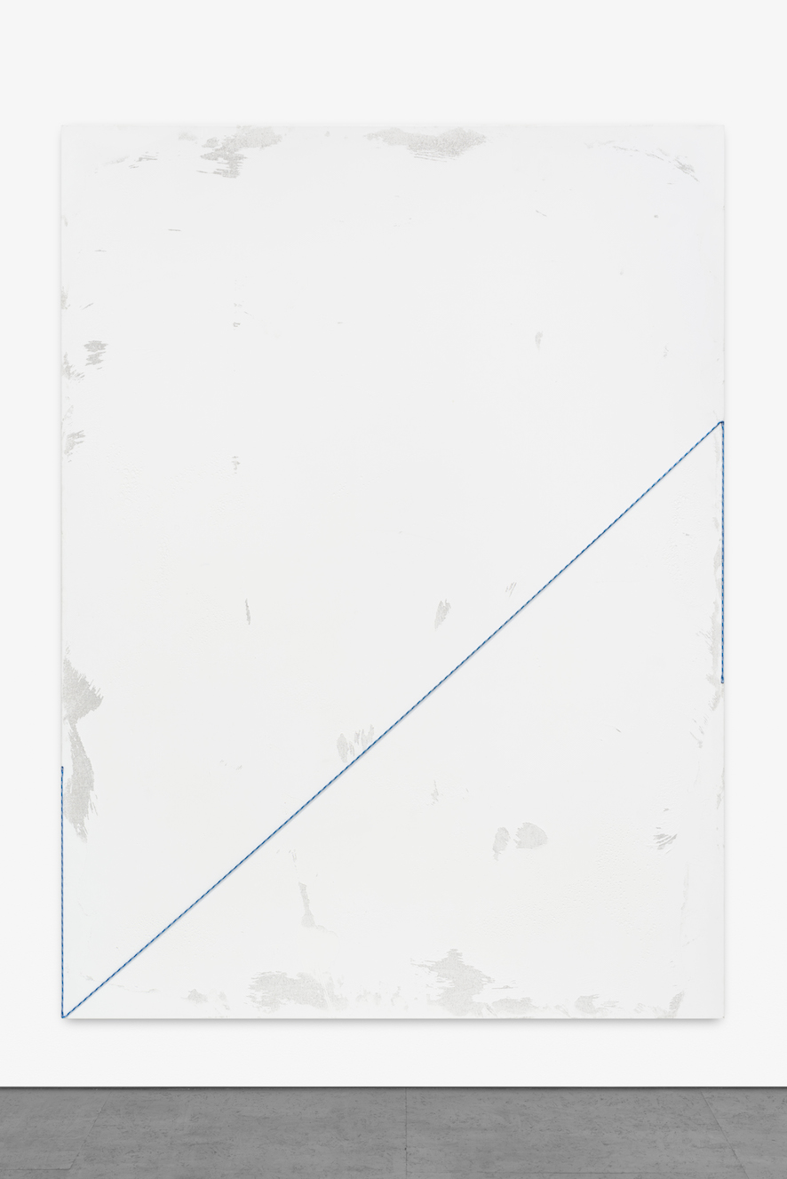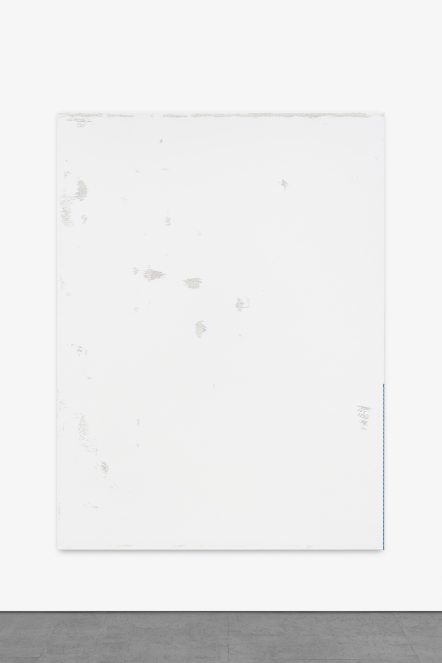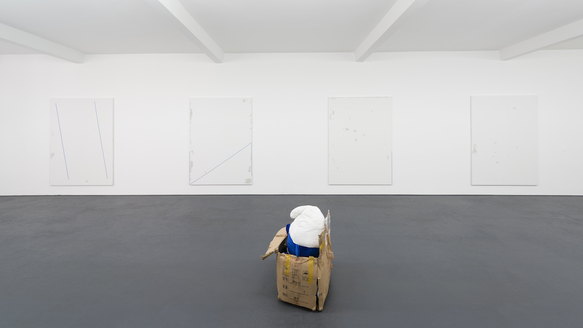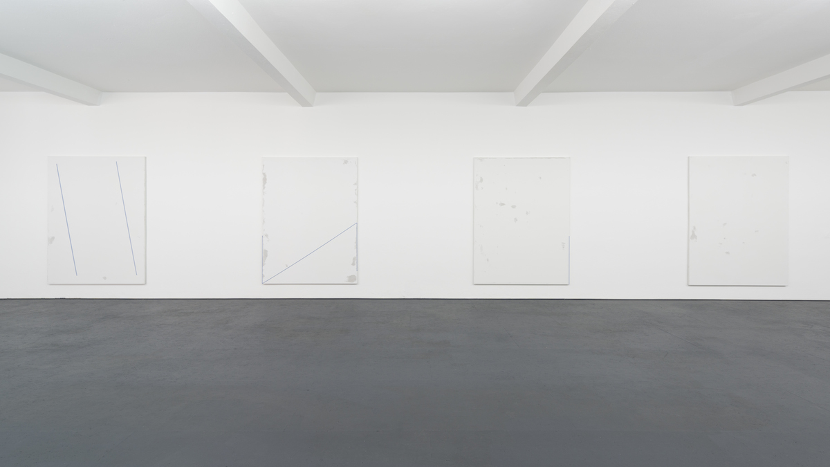 Jens Einhorn's new body of work, presented in Berlin for the first time, consists of a series of white, monochromatic paintings. Lengths of blue rope, subtly placed onto the surface of each of the canvases, act as a Leitfaden - a running thread - through which the works are simultaneously differentiated and tied together as a whole. Alternately evoking constraint and movement, they attempt to redefine and renavigate the space of the canvas, thereby mimicking the infinite possibilities of our own movement within space.