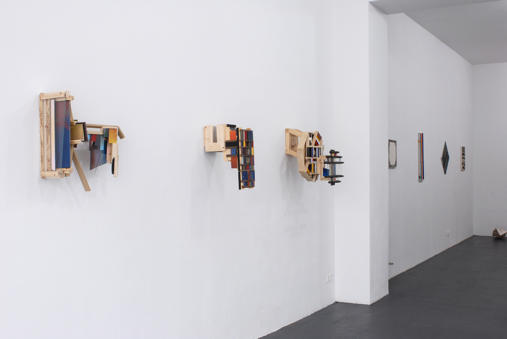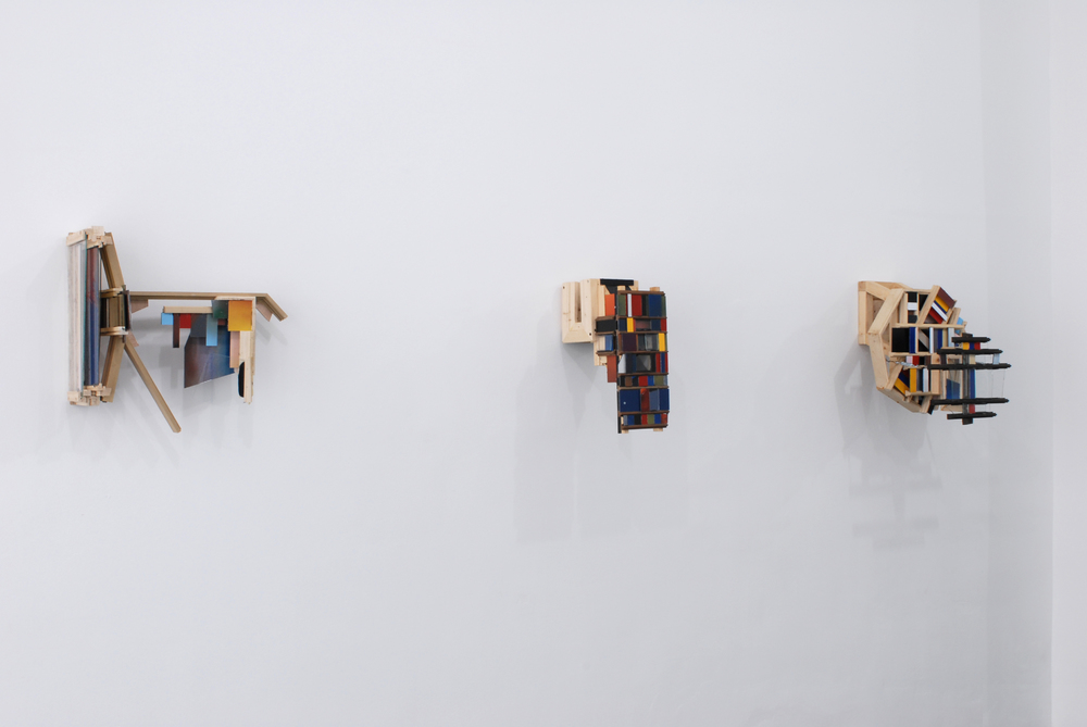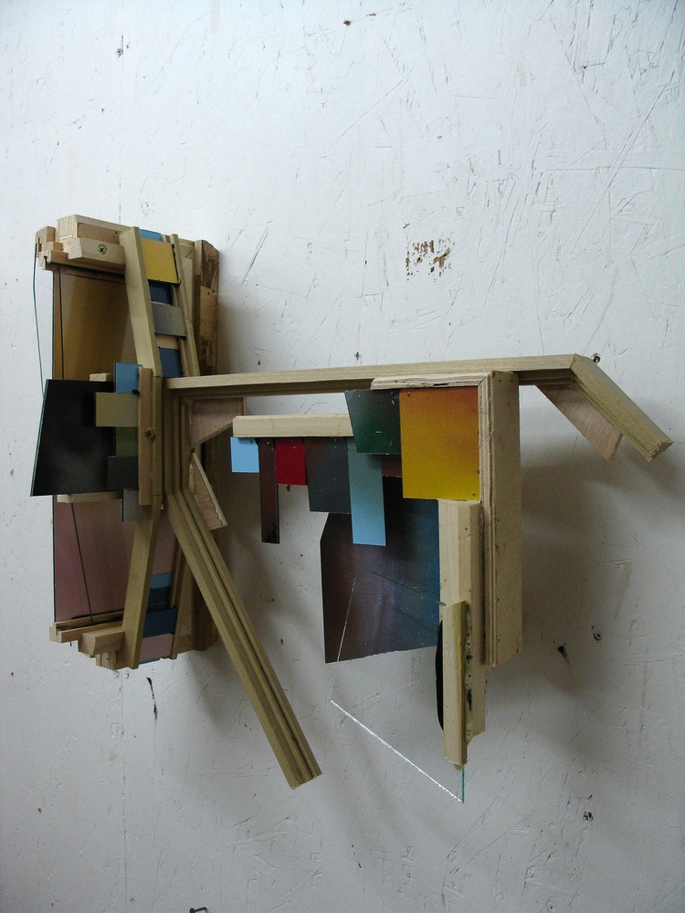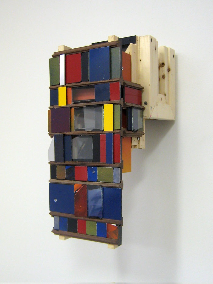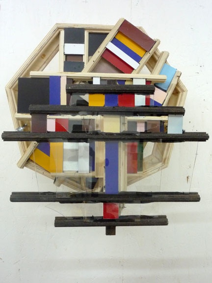 David Hendren takes a detour from the homogeneity of minimal sculpture by rethinking the properties of construction. Employing a modular approach, Hendren’s units are anything but standardized. Wall-hanging abstract sculptures of wood, glass, mirror and paint enact a frenzy of fragments that possess labyrinthine entry and exit points. The logic of each work depends on the dissonance created by all its parts. These objects resemble architectural studies of future cities where predictability and chaos splinter space to maximum effect.
