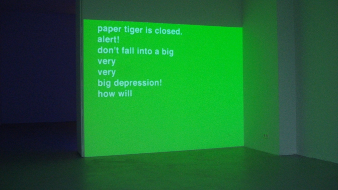 In her video cycle *Real World* German-born artist Halina Kliem presents a series of inner monologues that directly refer to situations and thoughts of everyday life. She has created a text image, which scrolls over a wall as if typed directly onto the screen.