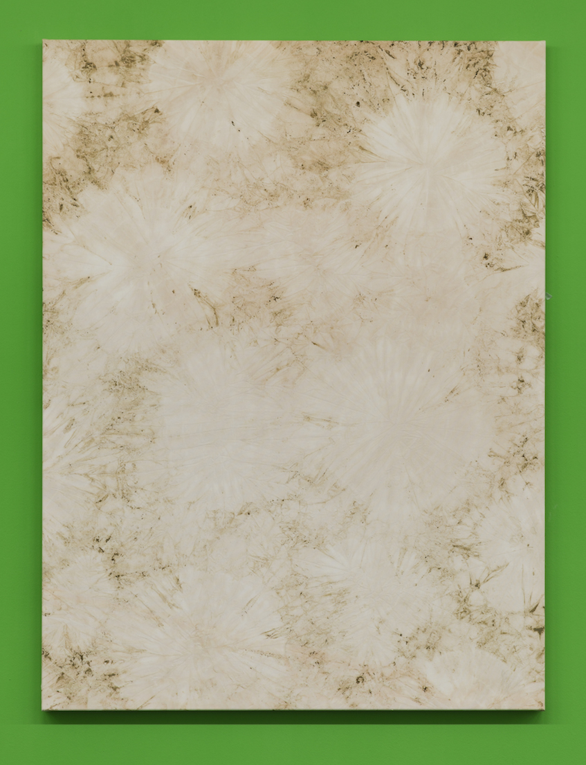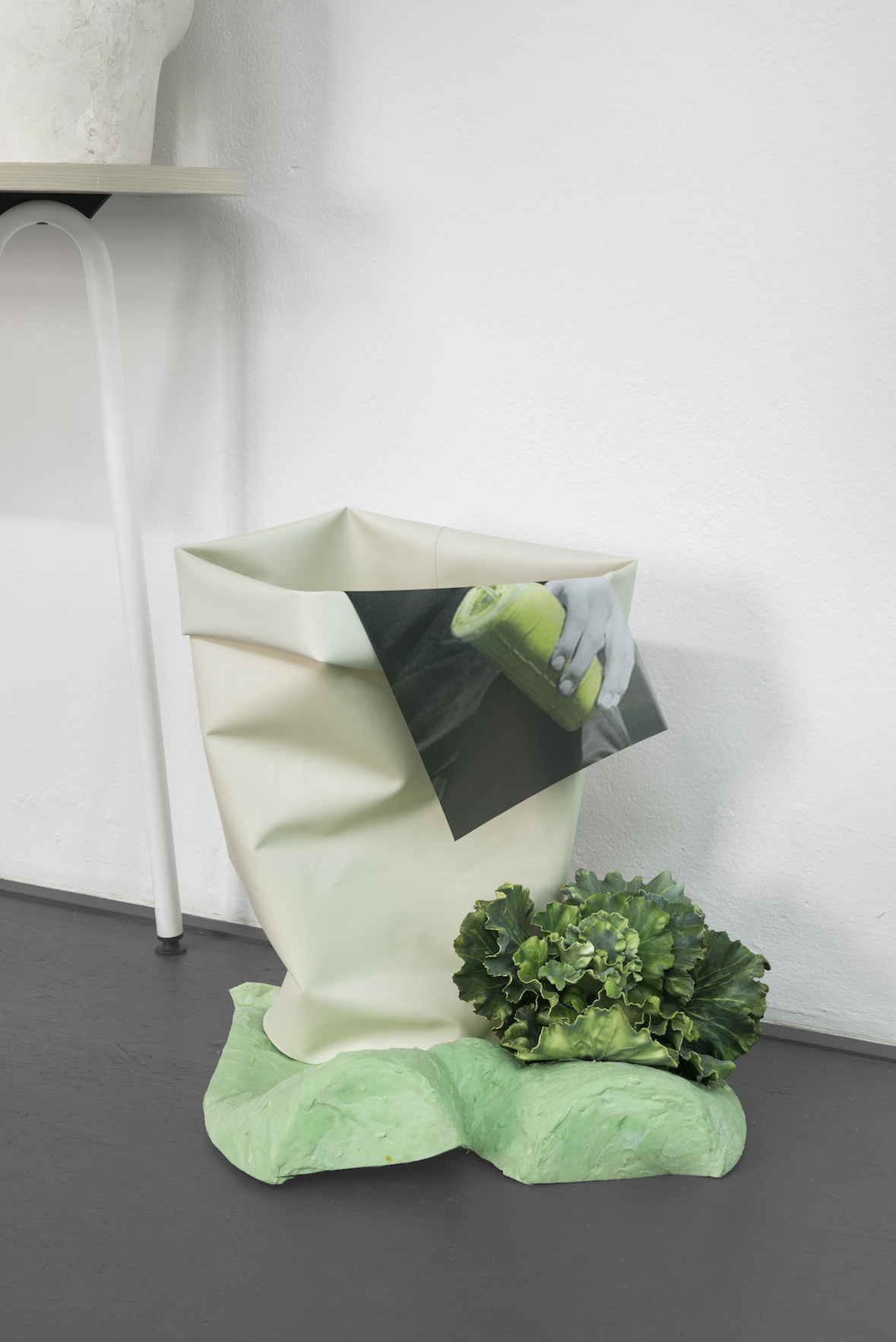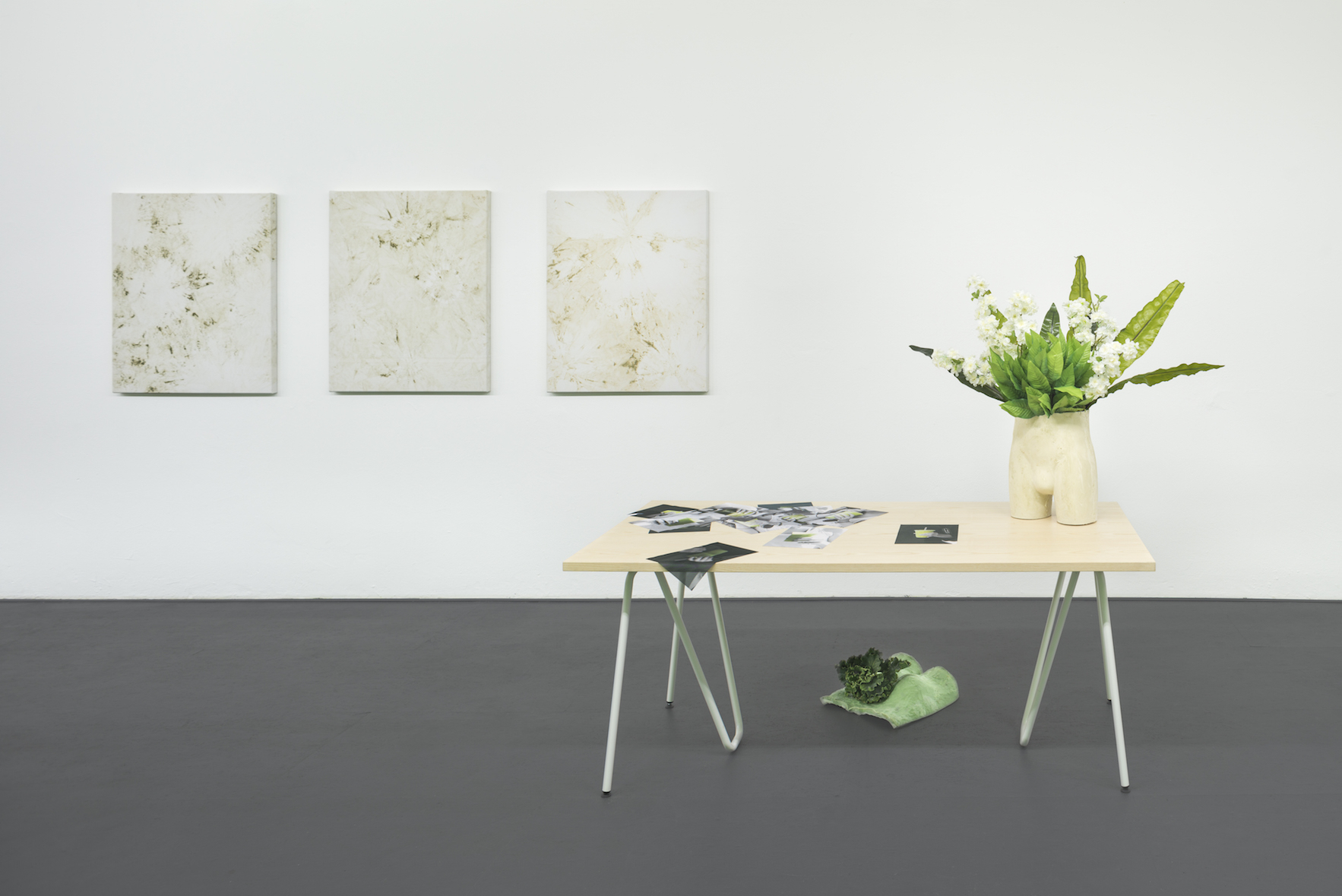 On the walls, abstract paintings made with matcha, wheat grass, “detox” and a “green beauty” powder form a series of works that underline both the decorative and the ideological aspects of consuming the products they are made with. Berlin based L&Z designer tables placed in the exhibition are covered with prints of the banners exhibited at AdK. The prints scattered on the tables give the impression of classic office paper while all over the room sculptures referring to an ideal human anatomy are filled with luscious flowers. All the works address a longing for an ecologically conscious, peaceful way to consume - in this case, through the consumption of healthy, expensive juices; yet, the feeling they supposedly convey is corrupted by what lies behind the works on view and the fictional product itself. Globalized agricultural trade is known to be an extremely aggressive economical environment, often keeping the primary producers of fruit and vegetables repressed and unable to make autonomous business decisions. The rough conditions in which often overpriced commodities are produced - such as the juices produced by MINT - are erased with smart and precise marketing tools, keeping our conscience clean while giving the impression that through adapting oneself to a certain lifestyle, we will be richer, healthier, happier. Through the medium of organic aesthetics, the MINT consumer is gulled by the allure and promise of a dream lifestyle. The space becomes an archetypal ‘new age’ office environment, seemingly subverting institutional hierarchy while insidiously remaining as a fundamentally capitalist structure. By including pieces produced by typical Berlin-based startups - namely bjuice and l&z elements - Delmar Corp. also ties notions of success and economic dynamism into her immersive installation, staging a cooperation between three brands that mostly target the same consumer group.