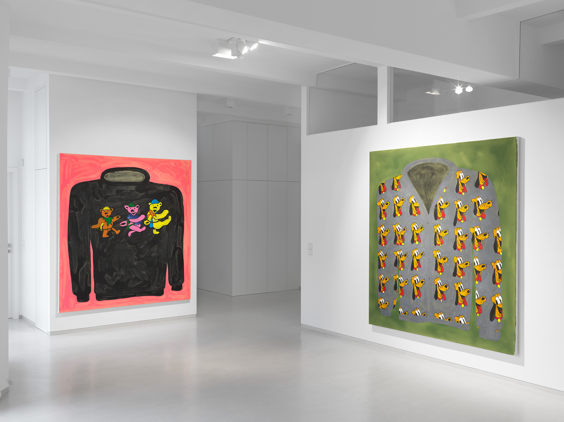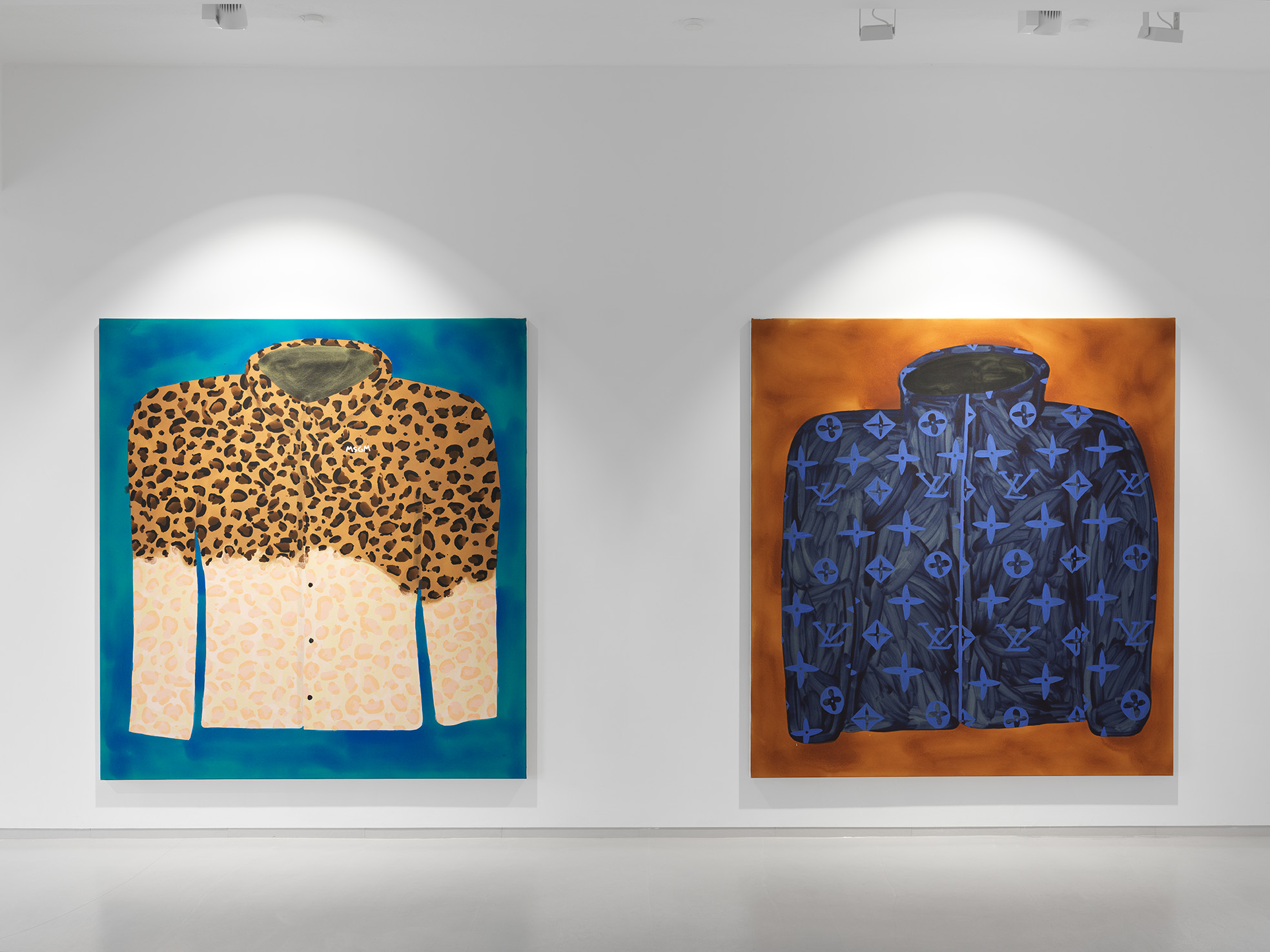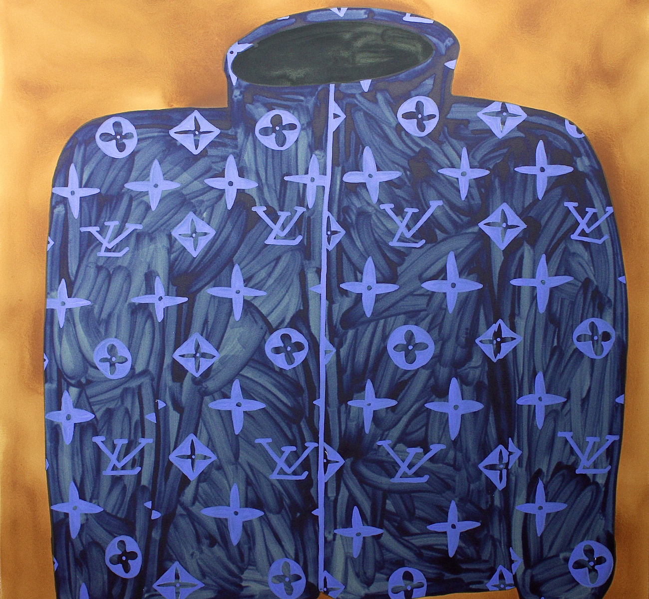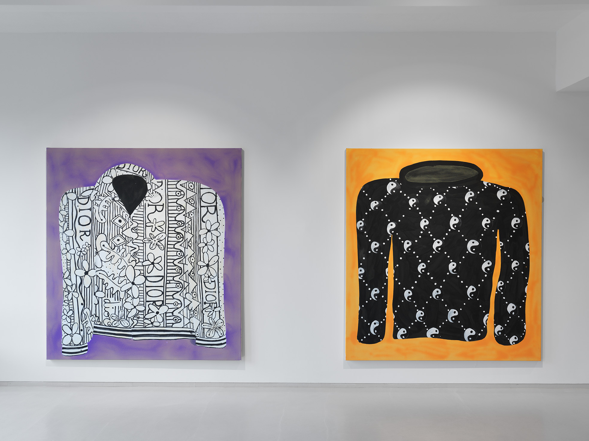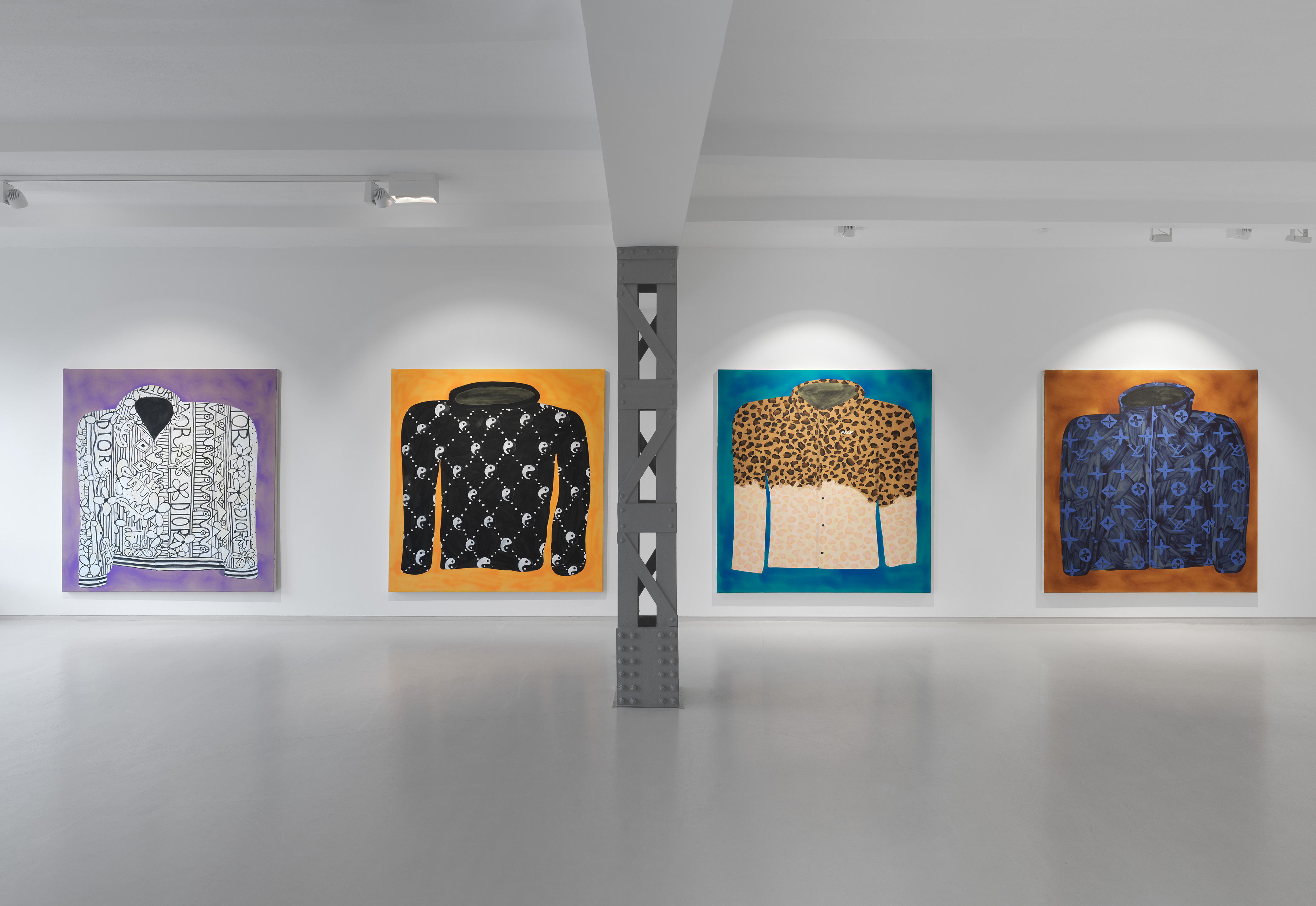 He also nonchalantly titles his exhibition *Jumpers*. And he delivers: 9 sweaters in different colors and with different motifs from the Grateful Dead to Pluto and Ying & Yang to Louis Vuitton and Dior. Streetwear and luxury, brands and bands. Fish paints with exceptional enthusiasm, the fanboy is at work. Everyone should see and know that. “When a brand drops a product, I paint it right away,” he says. Shortening labels to arouse desire. He doesn't stand in line, but in the studio and throws fanart into the hype cycle, while at the same time ensuring that the product is as short as possible - on his screen.