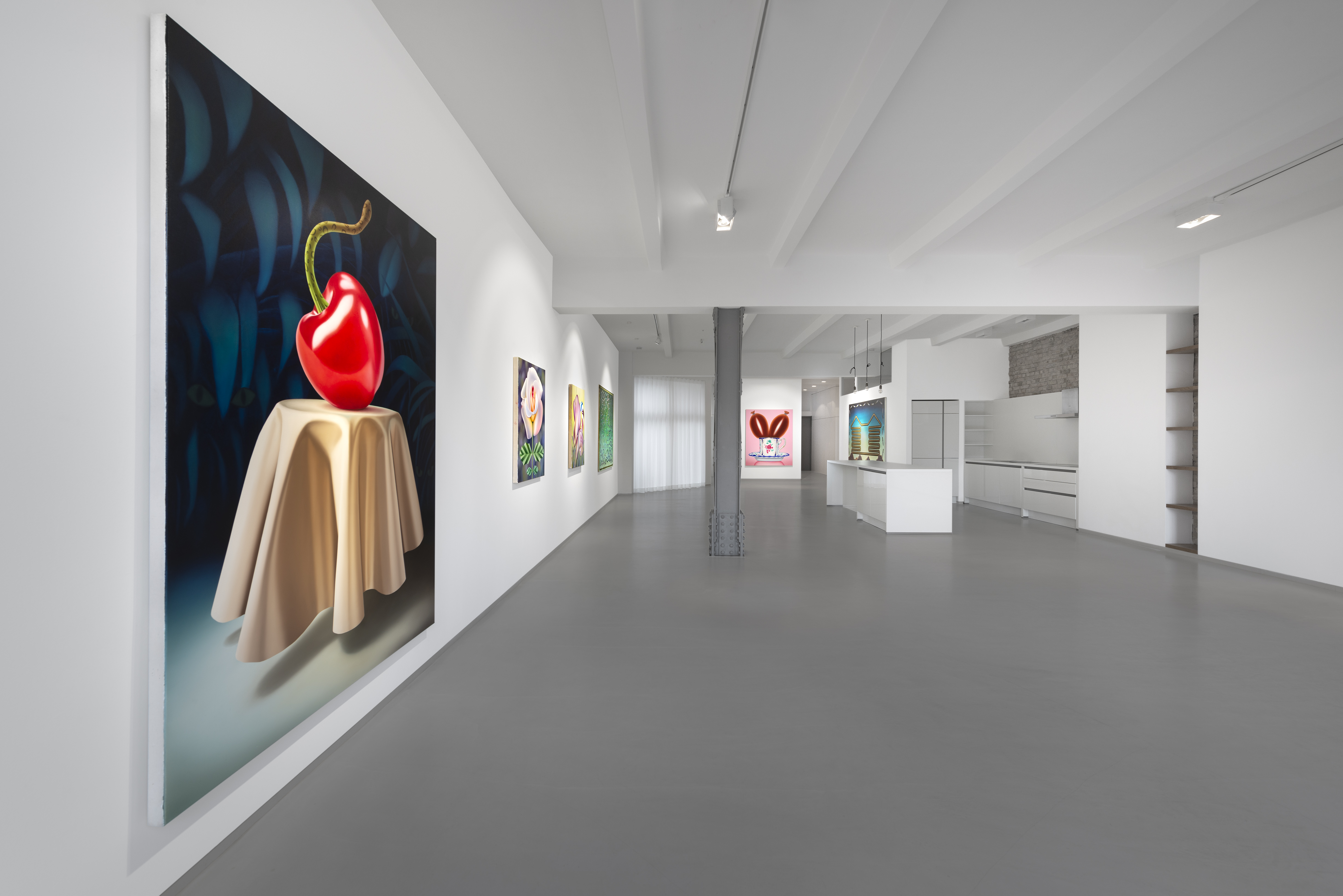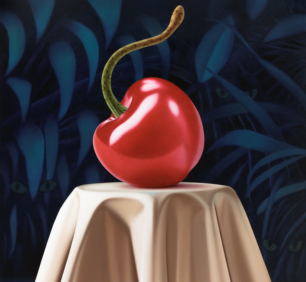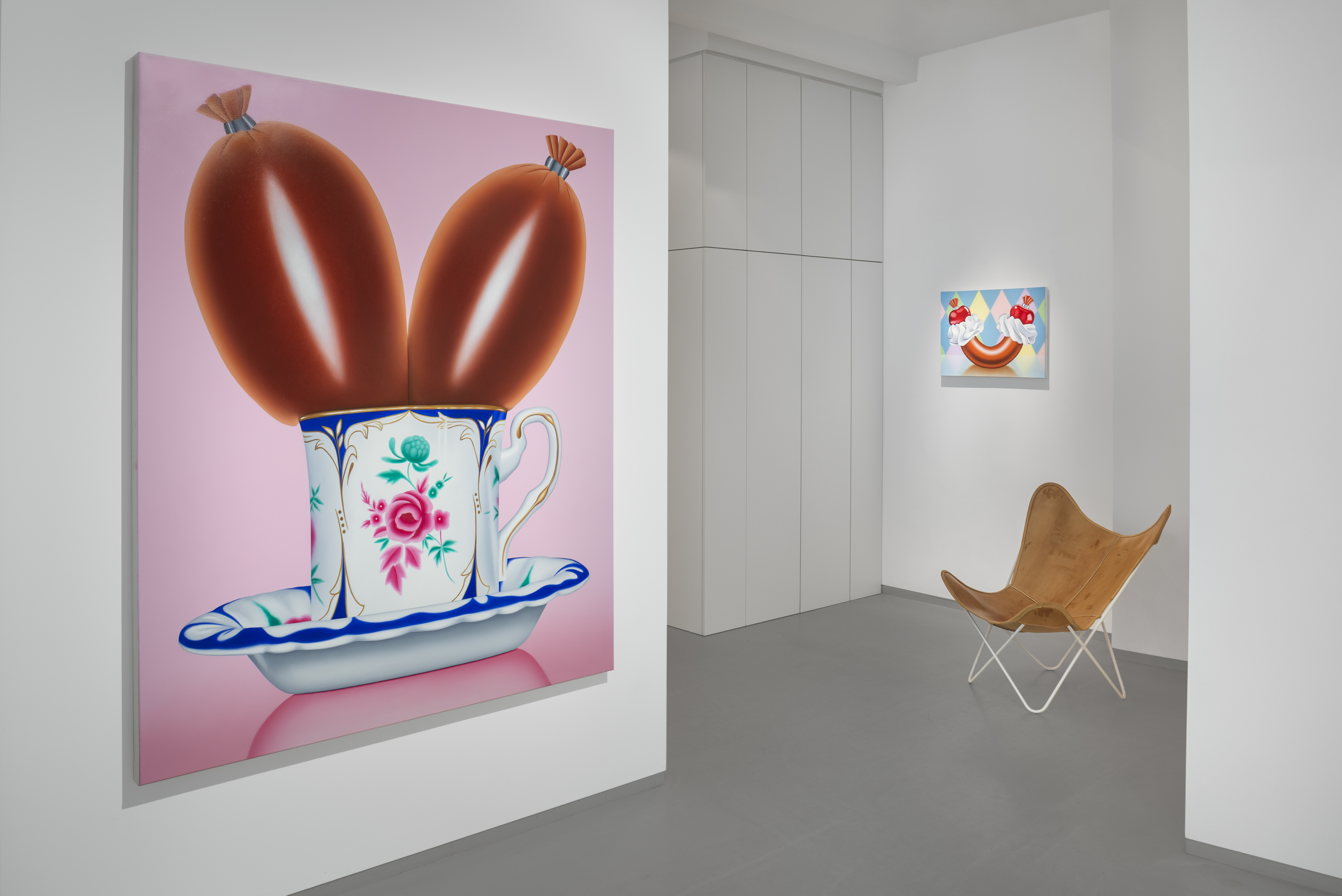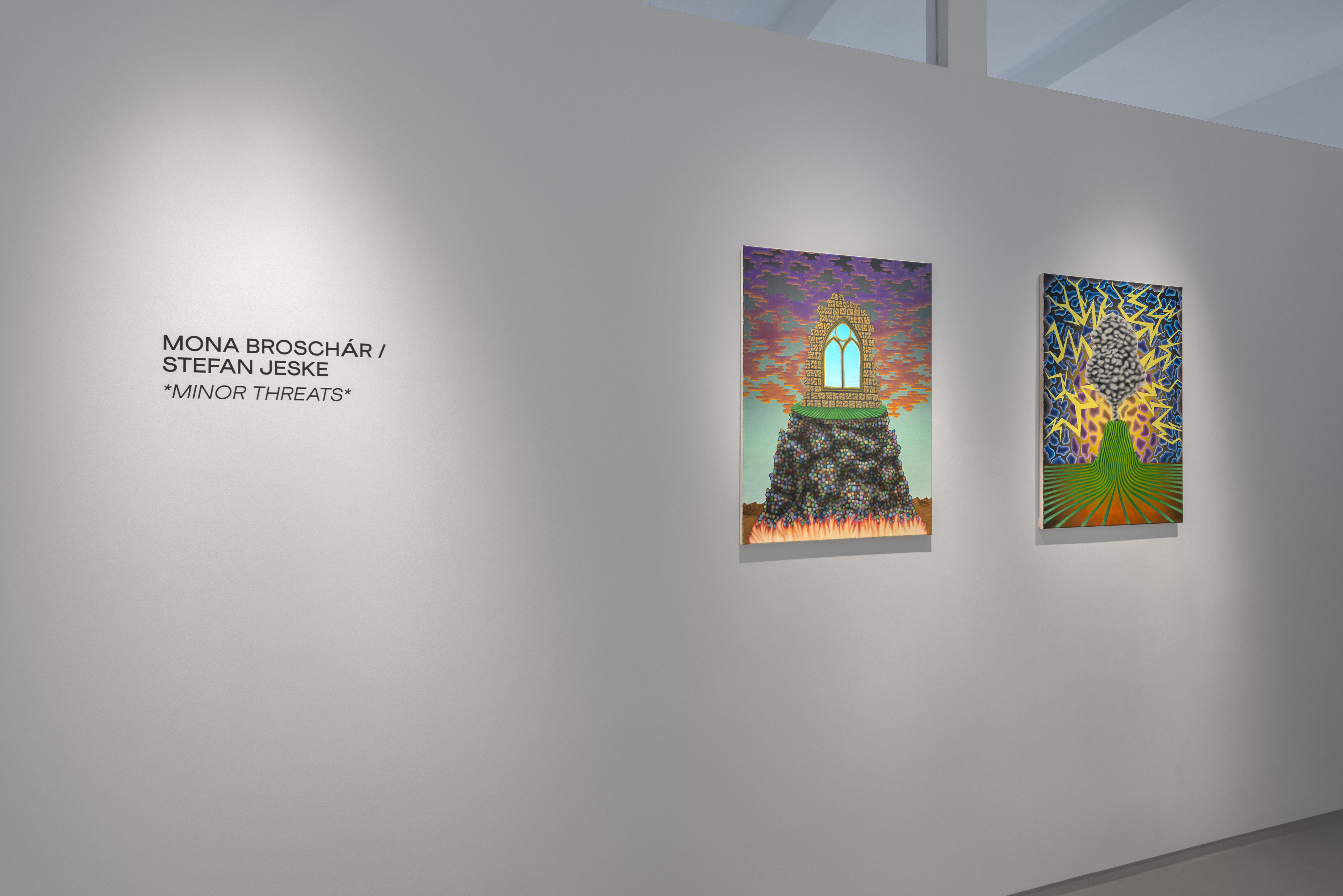 Mona Broschár's works are clearly structured, reduced and polished to a high gloss. Her quest for perfection reveals itself directly to the viewer. Her paintings depict creatures, objects, plants and food whose aesthetics are taken to such an extreme that they seem to come alive before our eyes. The works hover between the real and the imaginary, between immaculate beauty and a strange wonder that raises questions and hints at the threatening. Glowing eyes stare aggressively through dark branches at a seemingly floating table on which a large cherry is enthroned and from which a predatory cat's tail grows out instead of a stem. In a fine porcelain cup, oversized sausages threaten to burst at any moment. Cherries, sausages and cream are naturally combined. Mona Broschár's works reflect the desires, longings and cravings of our time from a personal perspective and activate countless visual and haptic sensory stimuli when viewed. The feast is served. Stefan Jeske's works, on the other hand, are equally tidy and orderly in their formal language, and show a limited repertoire of sometimes recurring objects. The result is a surreal pictorial world that subliminally carries human and socio-political thoughts that occupy the artist in his everyday life, but which do not reveal themselves on closer inspection. It smokes, it crashes, it burns. The titles of the works, which can be fragments of songs or messages, are an essential component. They frame each picture. Similar to populism, Stefan Jeske deliberately works with a naive and trivial processing of information. Here, however, the attempt to find simple answers to major global problems is based on acceptance and the awareness that it will probably never succeed. He makes the struggle with one's own thoughts visible and creates magical places where friction and resistance actually prevail. In the exhibition “Minor Threats”, Mona Broschár and Stefan Jeske present colourful and tense visual worlds in which superficiality plays a decisive role. A poppy, smooth aesthetic underlies the works, under which the threat lurks in silence. The number of pictorial objects is deliberately reduced in order not to overload the pictorial space. While Mona Boschár makes visible the excess and greed, the insatiable desire for beautiful things and food, Stefan Jeske deals with the noise, the countless contradictions and impressions in our society in a humorous and symbolic way. Both artistic positions comment on social conditions, starting from the object and a diffuse state, without being preachy or intrusive, always moving on the border between reality and fiction.