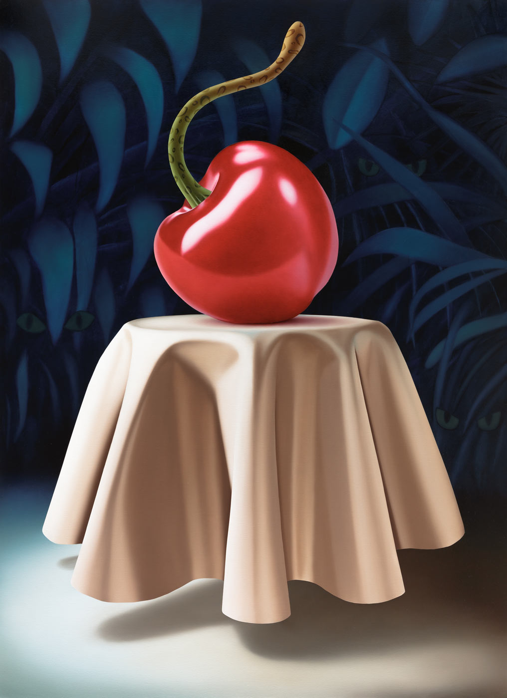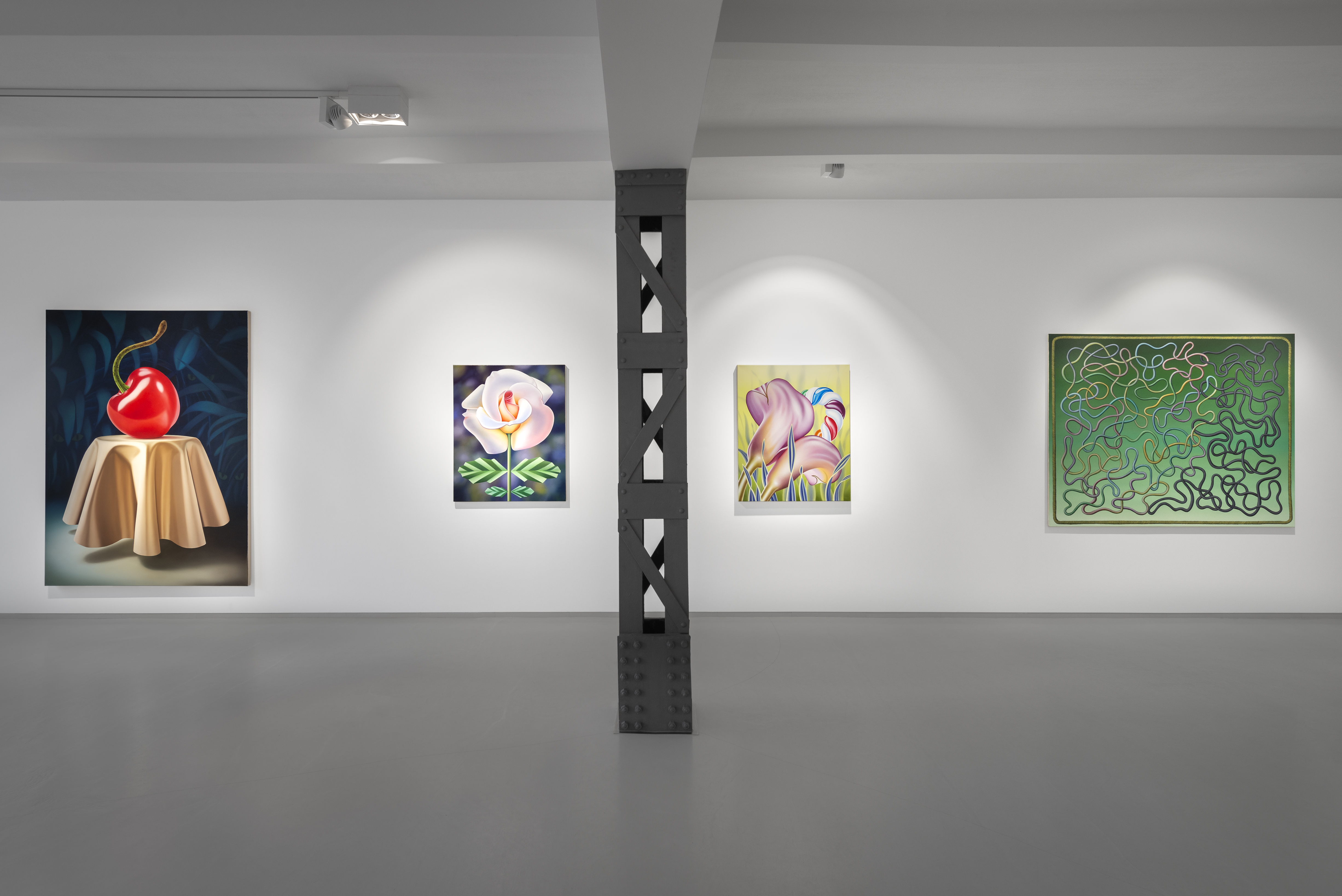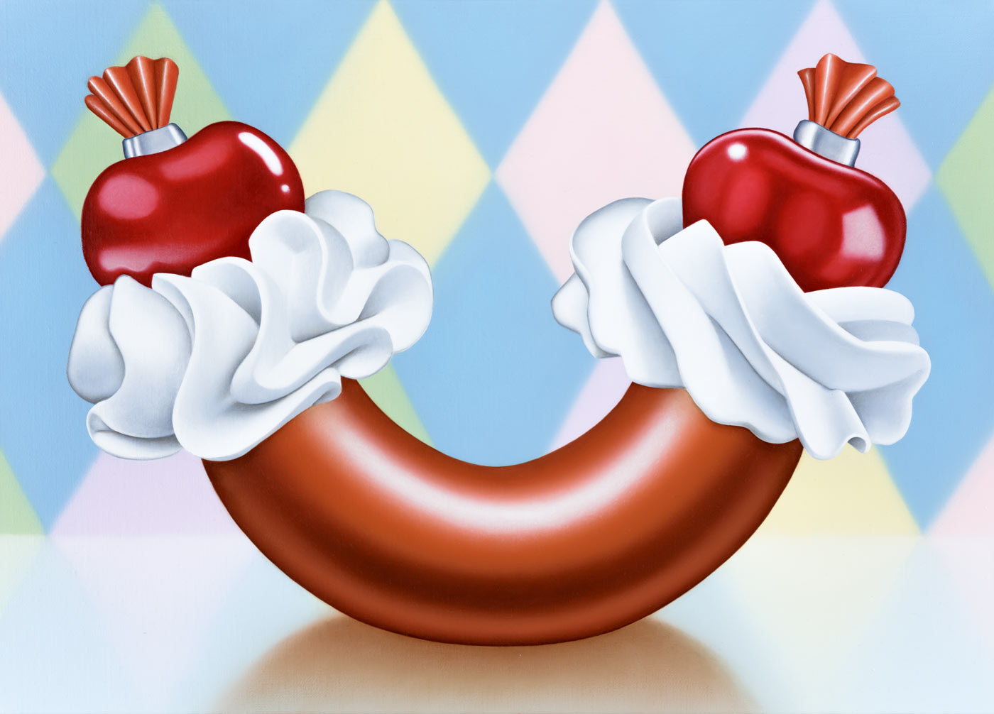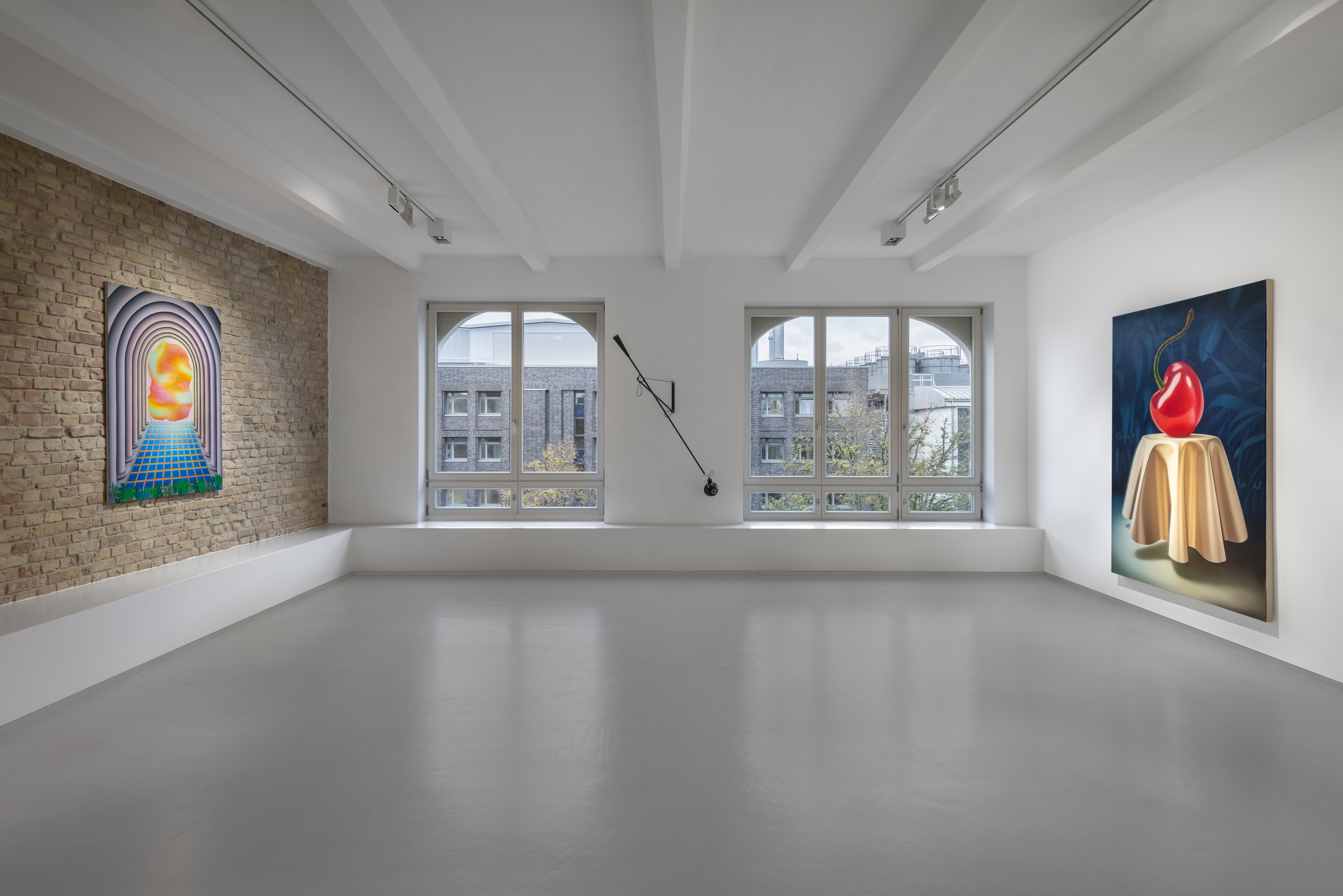 Mona Broschár's works are clearly structured, reduced and polished to a high gloss. Her quest for perfection reveals itself directly to the viewer. Her paintings depict creatures, objects, plants and food whose aesthetics are taken to such an extreme that they seem to come alive before our eyes. The works hover between the real and the imaginary, between immaculate beauty and a strange wonder that raises questions and hints at the threatening. Glowing eyes stare aggressively through dark branches at a seemingly floating table on which a large cherry is enthroned and from which a predatory cat's tail grows out instead of a stem. In a fine porcelain cup, oversized sausages threaten to burst at any moment. Cherries, sausages and cream are naturally combined. Mona Broschár's works reflect the desires, longings and cravings of our time from a personal perspective and activate countless visual and haptic sensory stimuli when viewed. The feast is served. Stefan Jeske's works, on the other hand, are equally tidy and orderly in their formal language, and show a limited repertoire of sometimes recurring objects. The result is a surreal pictorial world that subliminally carries human and socio-political thoughts that occupy the artist in his everyday life, but which do not reveal themselves on closer inspection. It smokes, it crashes, it burns. The titles of the works, which can be fragments of songs or messages, are an essential component. They frame each picture. Similar to populism, Stefan Jeske deliberately works with a naive and trivial processing of information. Here, however, the attempt to find simple answers to major global problems is based on acceptance and the awareness that it will probably never succeed. He makes the struggle with one's own thoughts visible and creates magical places where friction and resistance actually prevail. In the exhibition “Minor Threats”, Mona Broschár and Stefan Jeske present colourful and tense visual worlds in which superficiality plays a decisive role. A poppy, smooth aesthetic underlies the works, under which the threat lurks in silence. The number of pictorial objects is deliberately reduced in order not to overload the pictorial space. While Mona Boschár makes visible the excess and greed, the insatiable desire for beautiful things and food, Stefan Jeske deals with the noise, the countless contradictions and impressions in our society in a humorous and symbolic way. Both artistic positions comment on social conditions, starting from the object and a diffuse state, without being preachy or intrusive, always moving on the border between reality and fiction.