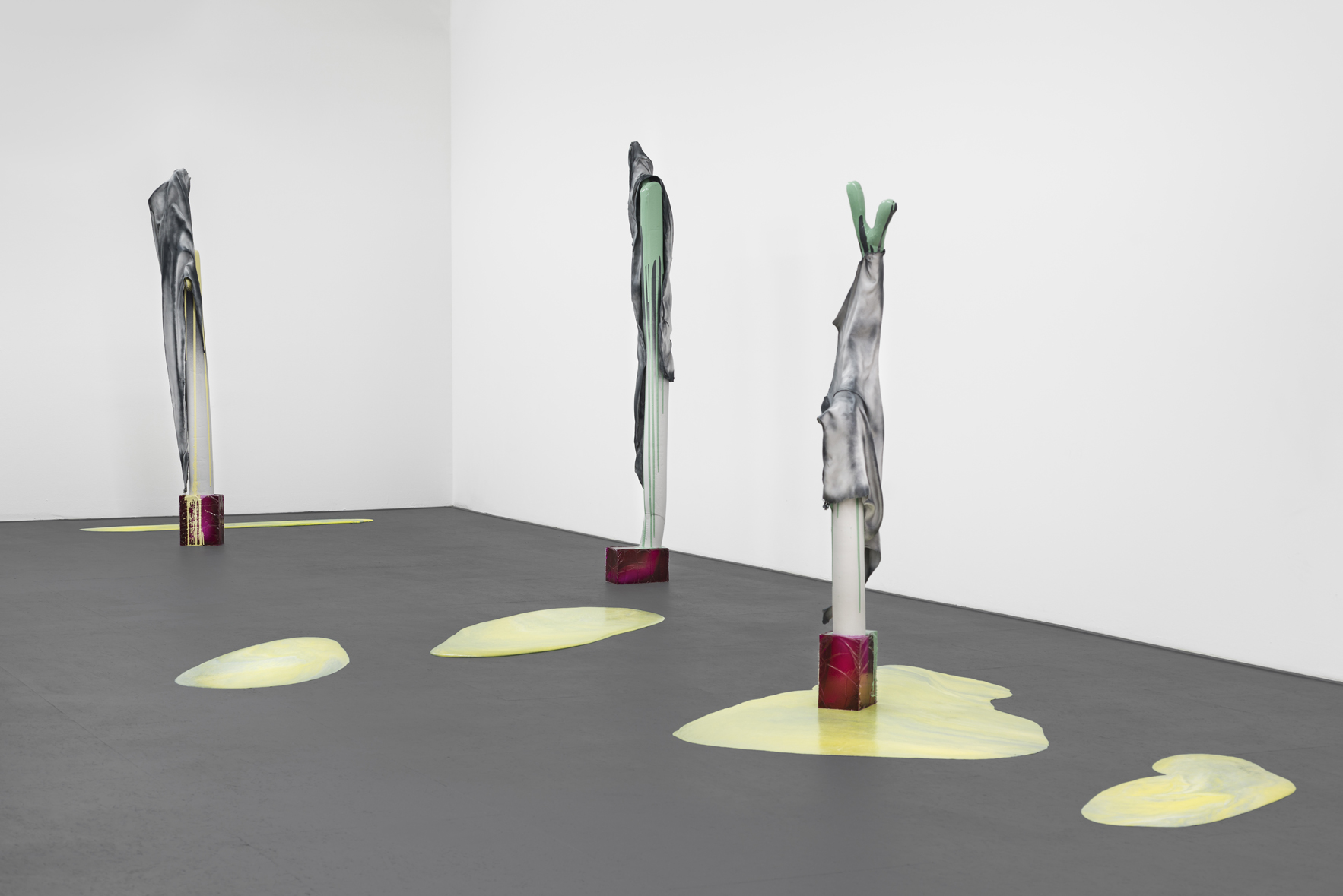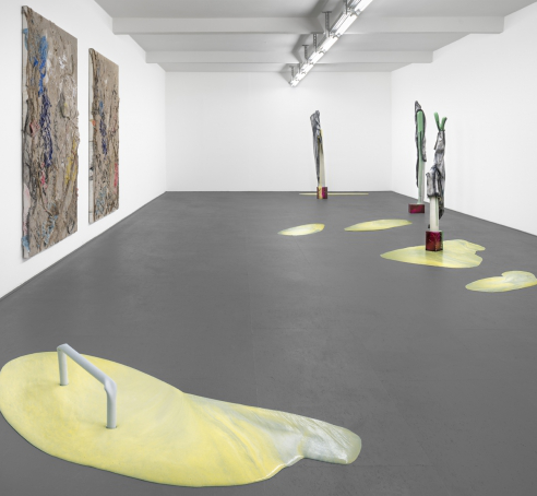 In *VITA PARCOURS*, sculptures, paintings, puddles and wall reliefs interact as consequential gestures building up towards an immersive choreography. Each work encapsulates its predecessor and successor in (the) space; their vigorous, yet static character reveals the fragility of force and a sensual vulnerability within their nature. The works displayed in the show also ooze a warm feeling of fatigue and finitude. They are the end product of demanding processes and their physicality is directly linked to their creator’s efforts. Instead of hiding this, *VITA PARCOURS* partially aims to accentuate the bodily aspect of the presented pieces and art production itself. Luster, graininess, irregularities, perforations: such elements refer directly to the presence of an acting and active body - human or synthetic - in their making.